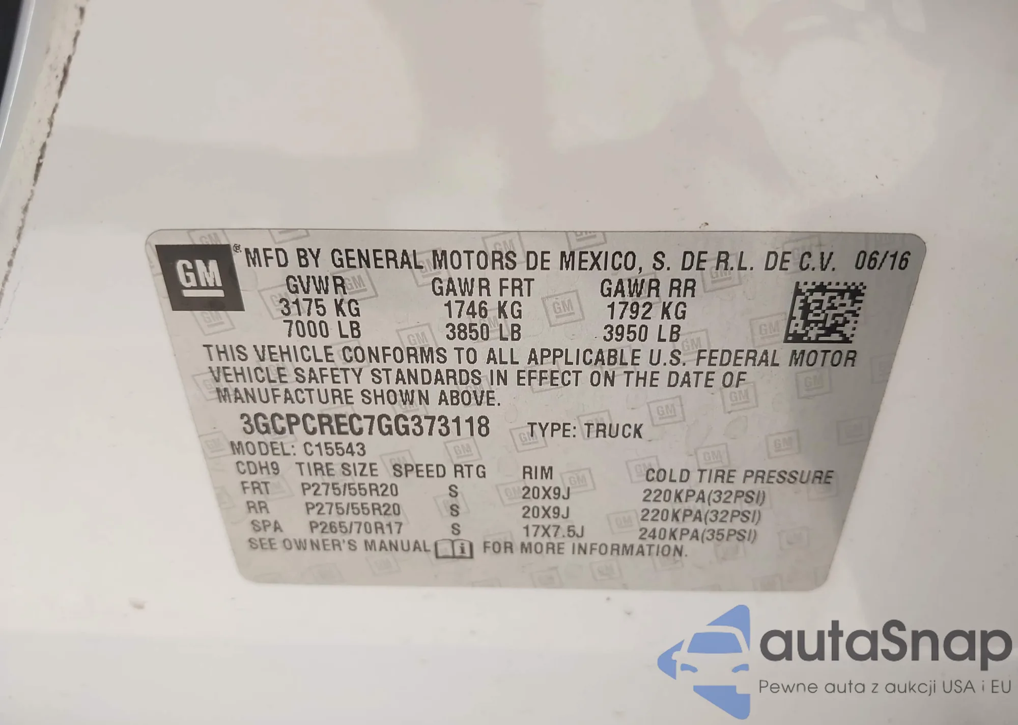 LOT: 43377538 VIN: 3GCPCREC7GG373118