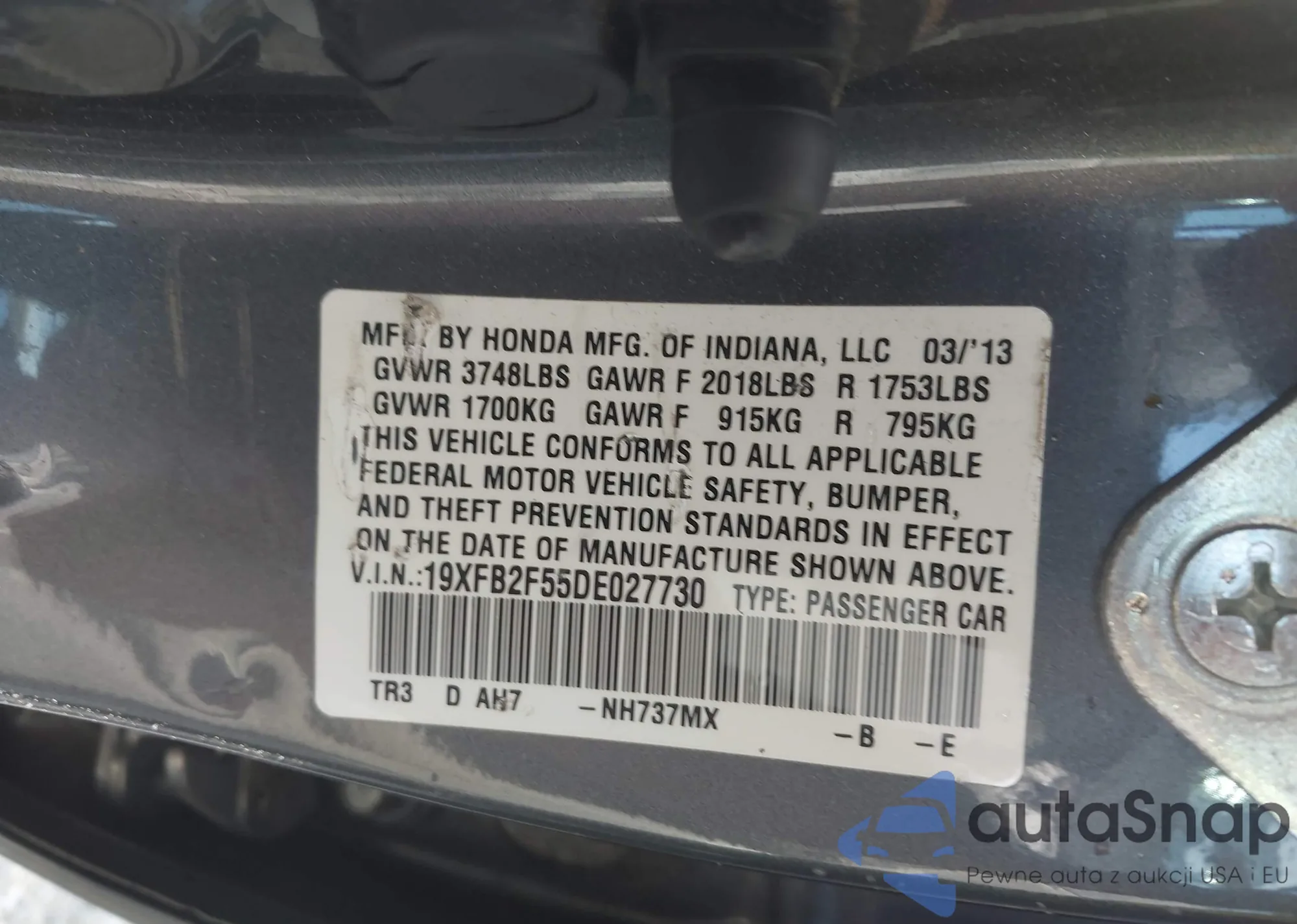 LOT: 43360631 VIN: 19XFB2F55DE027730