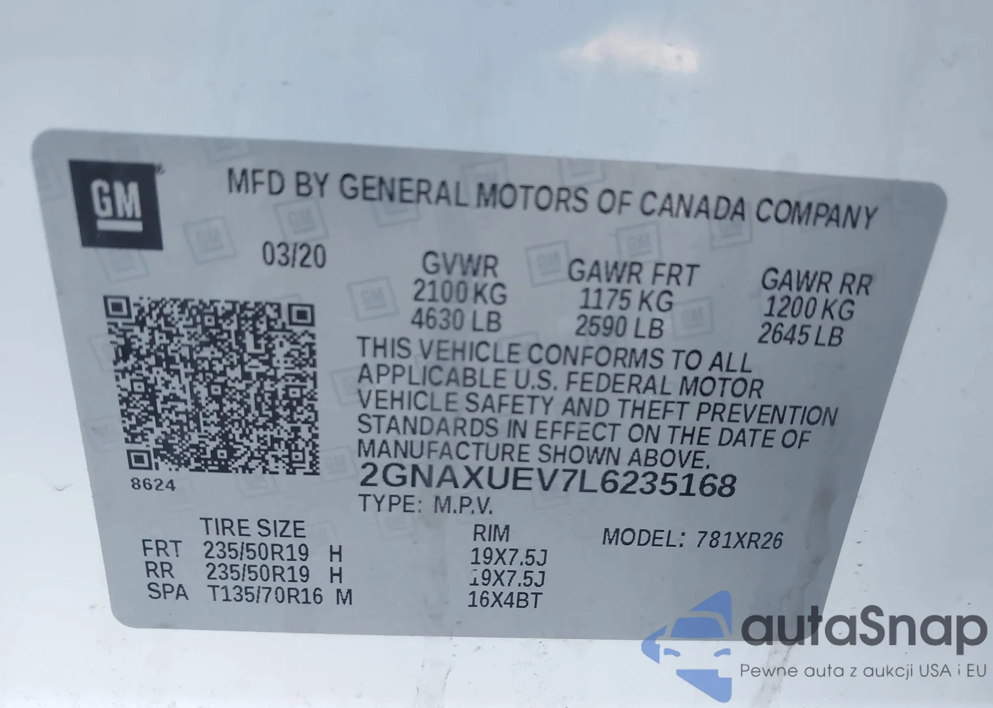 LOT: 43361405 VIN: 2GNAXUEV7L6235168