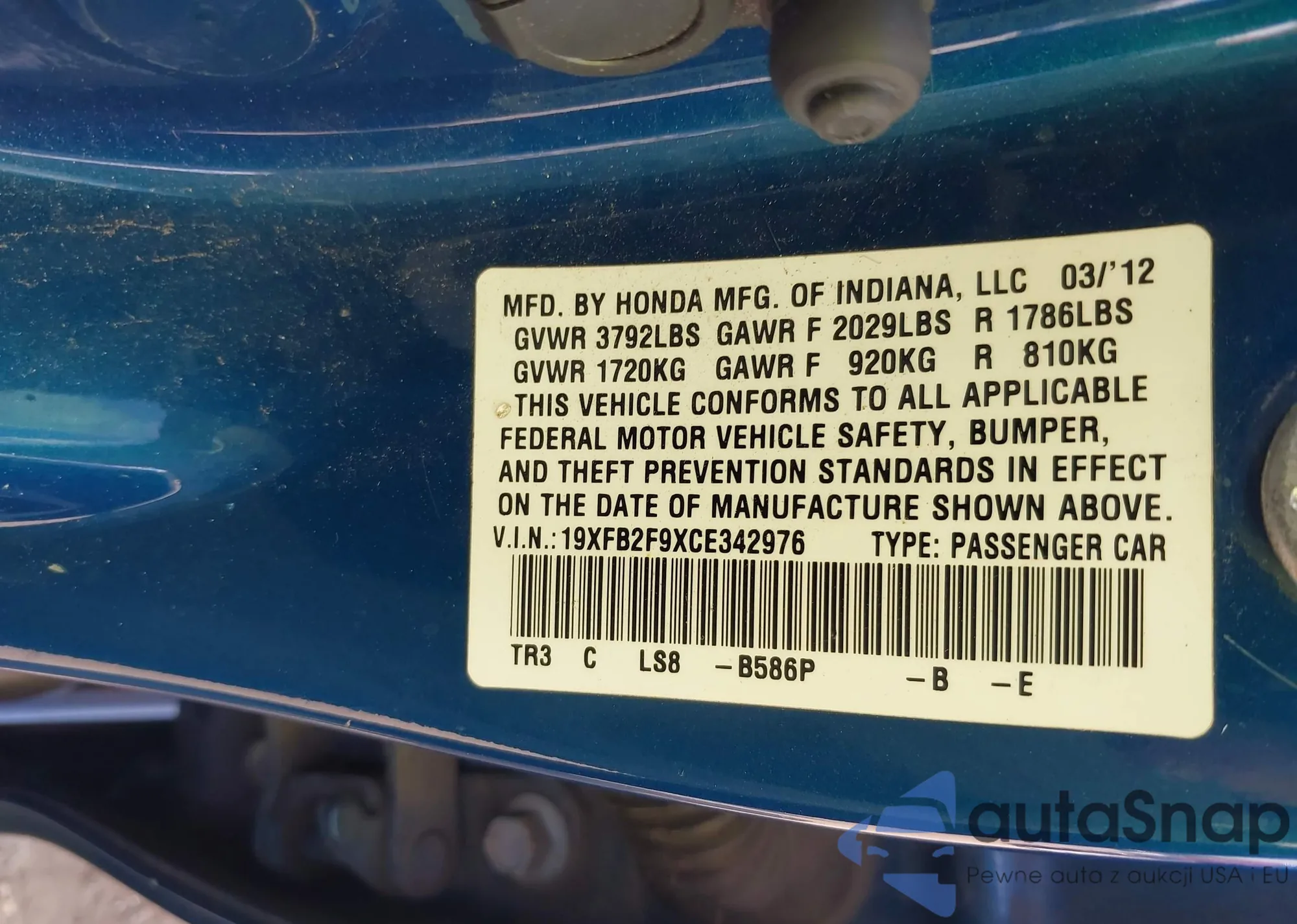 • VIN 19XFB2F9XCE342976