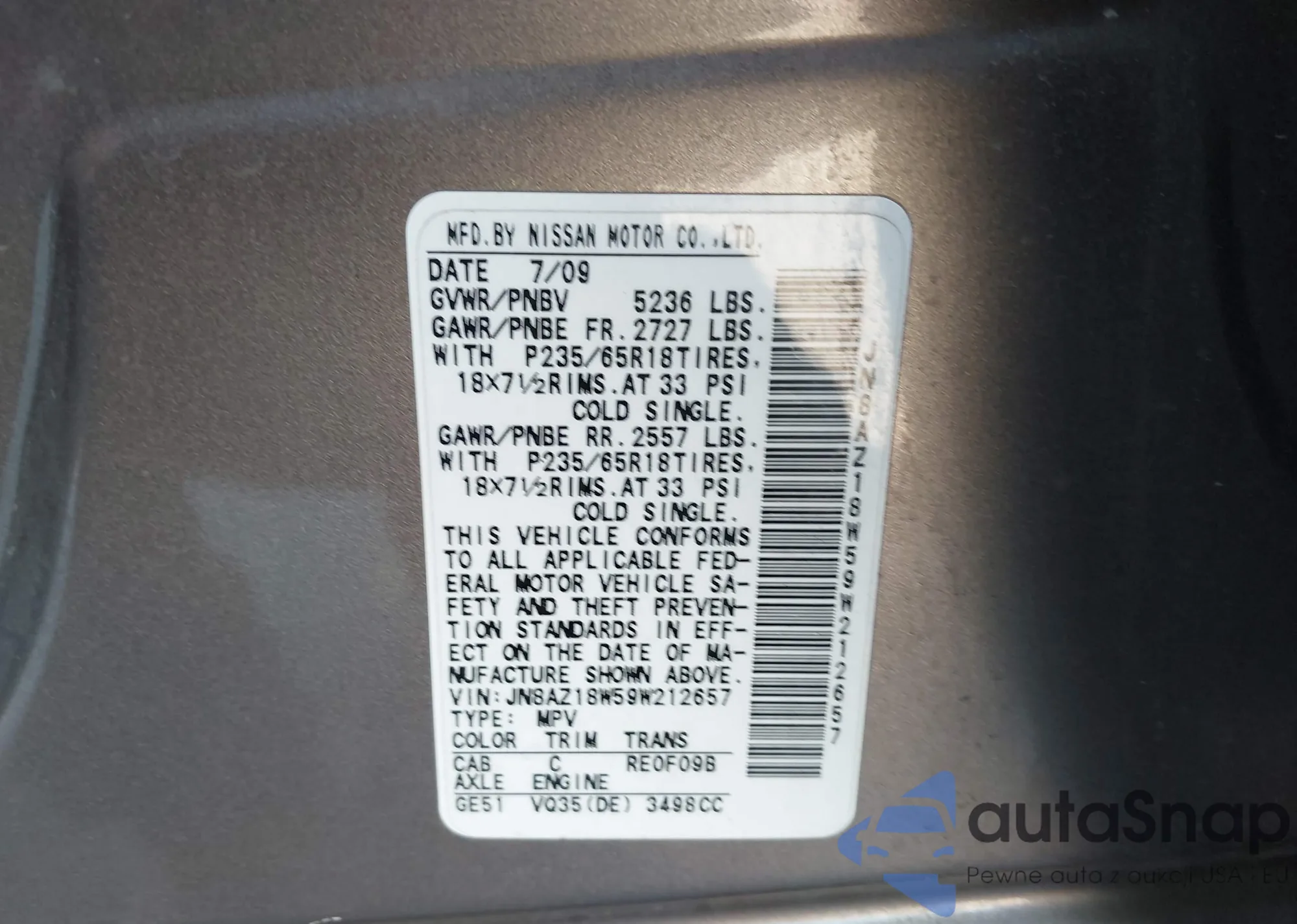 LOT: 43375813 VIN: JN8AZ18W59W212657