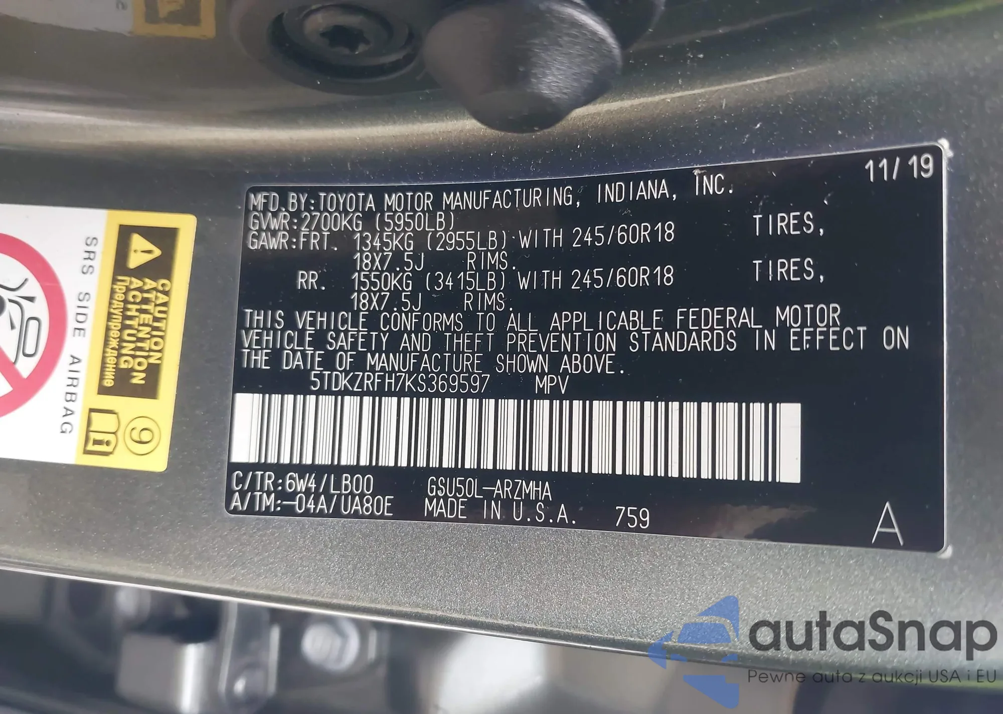 LOT: 43424307 VIN: 5TDKZRFH7KS369597
