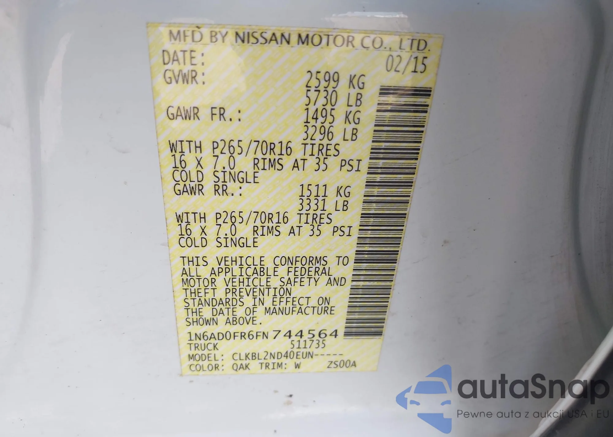 LOT: 43460806 VIN: 1N6AD0FR6FN744564