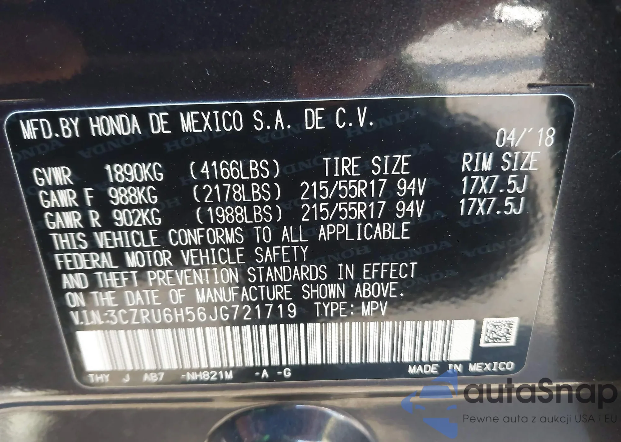• VIN 3CZRU6H56JG721719