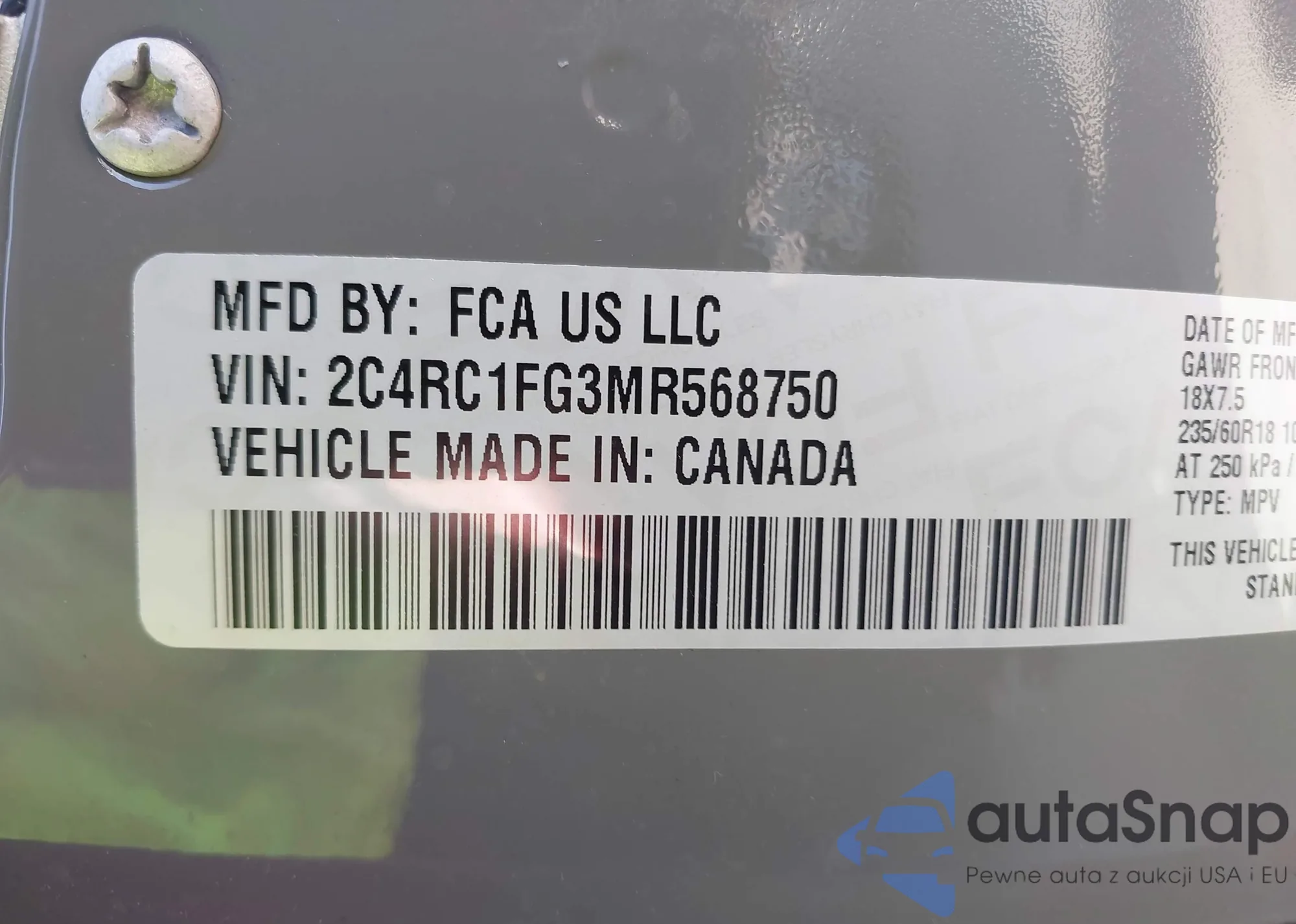 2021 Chrysler Pacifica Touring из США, поврежденный, VIN 2C4RC1FG3MR568750