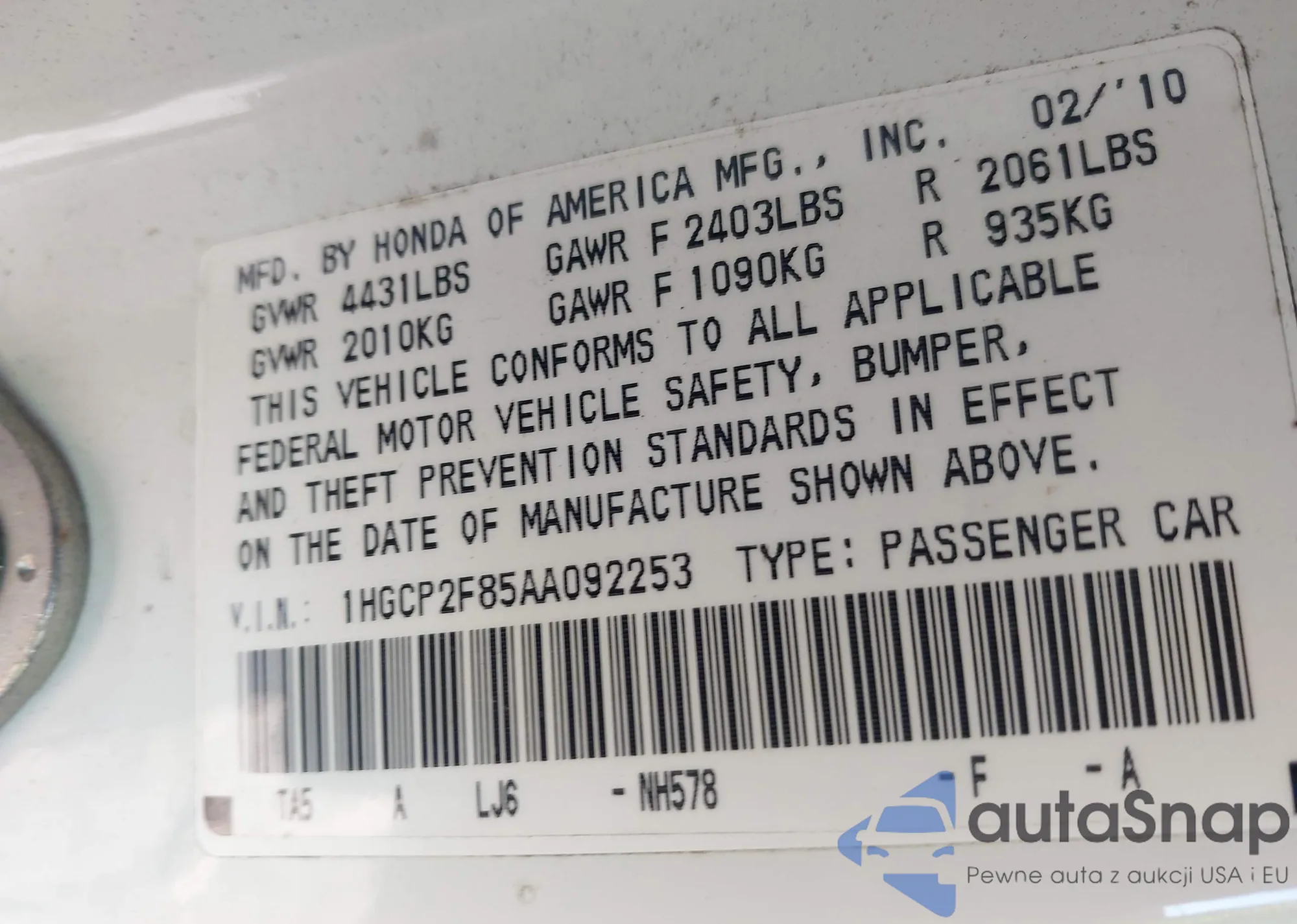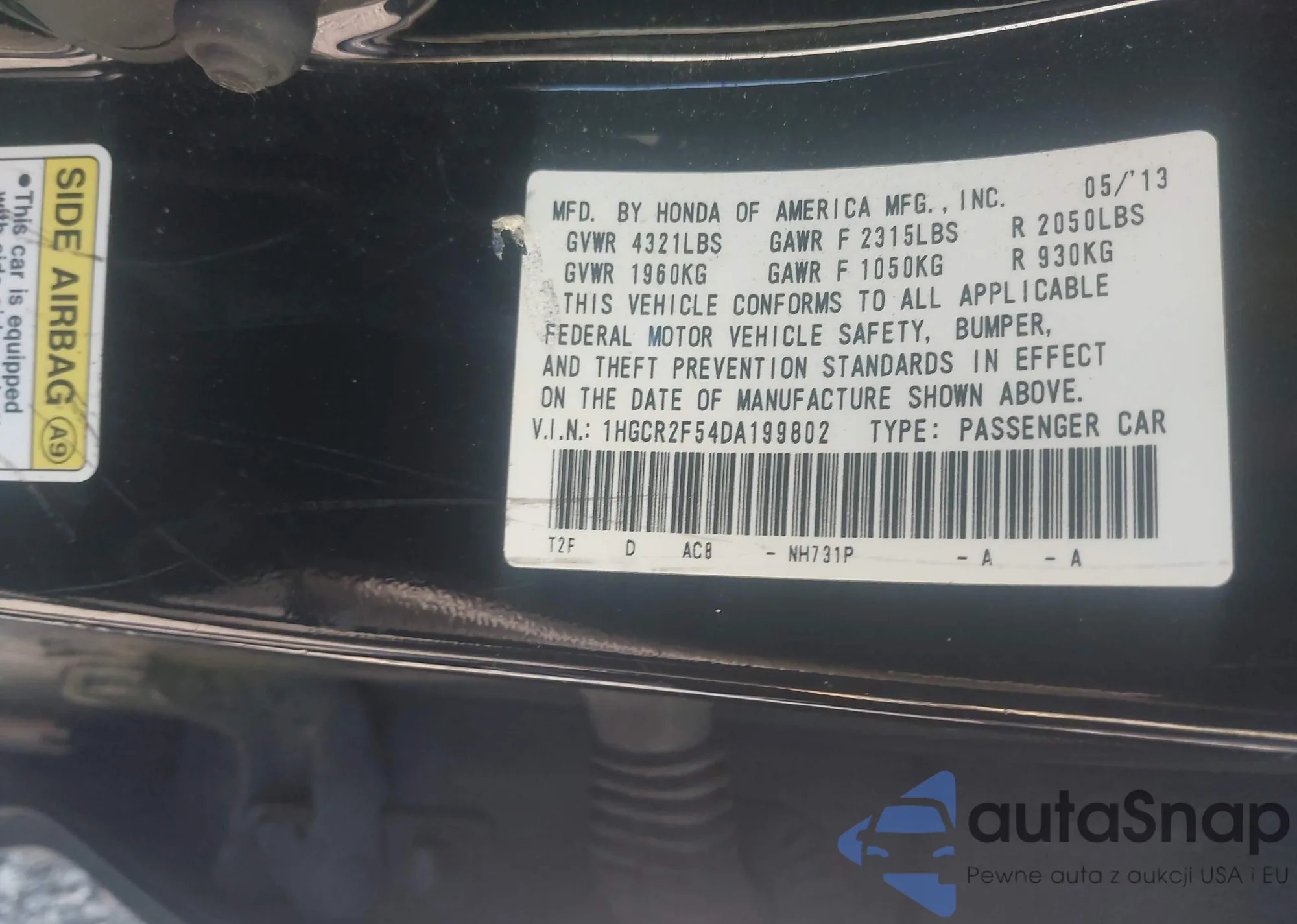 • VIN 1HGCR2F54DA199802