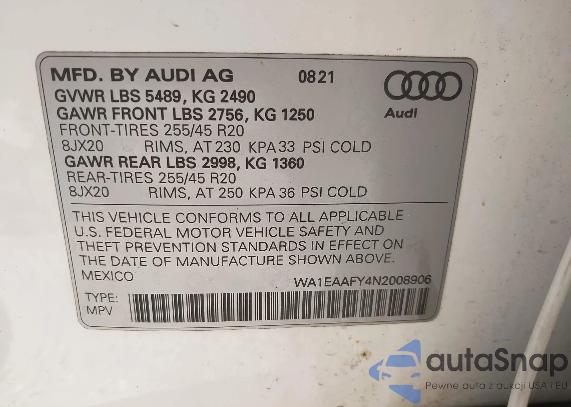 LOT: 43457575 VIN: WA1EAAFY4N2008906
