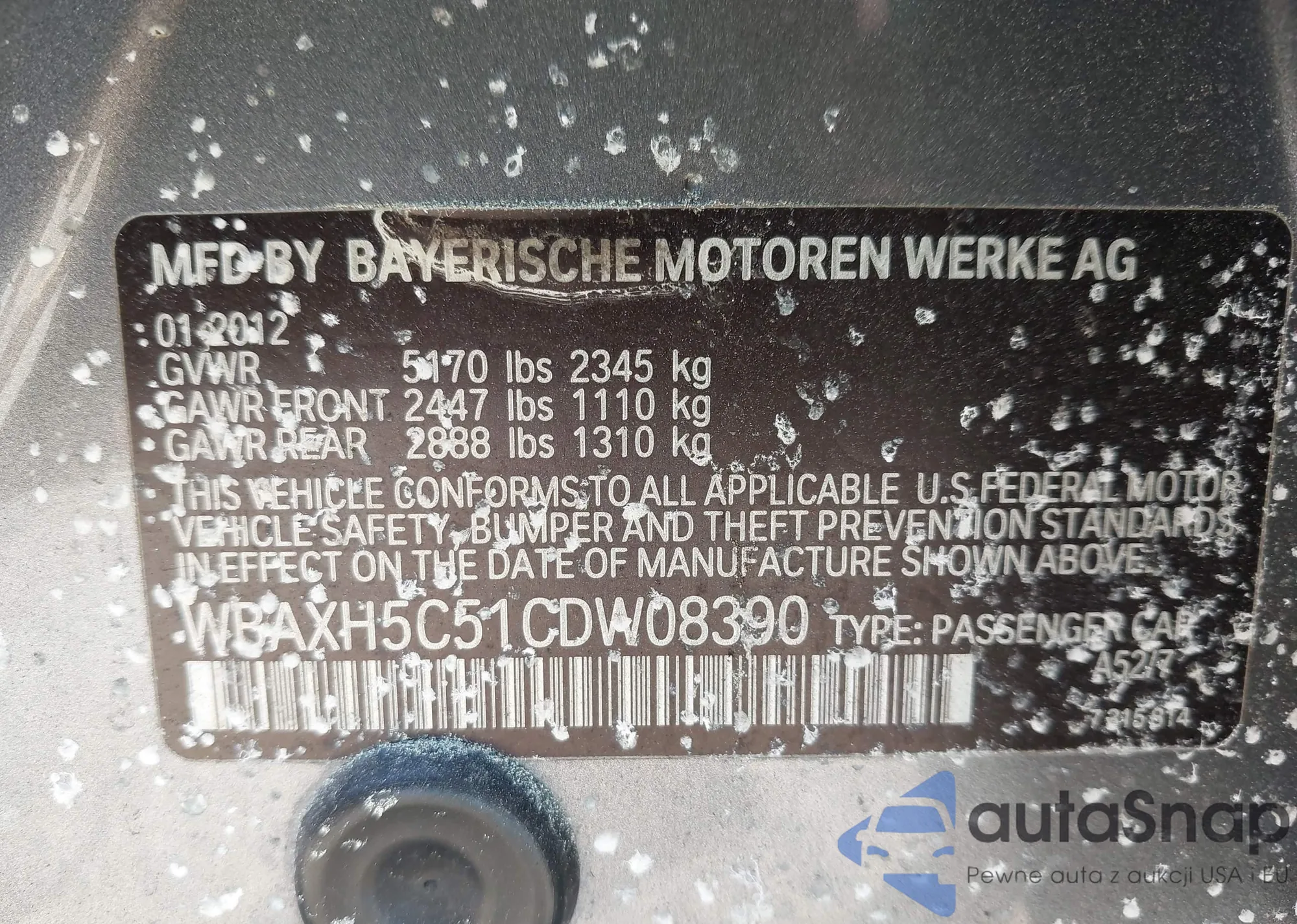 LOT: 43053012 VIN: WBAXH5C51CDW08390