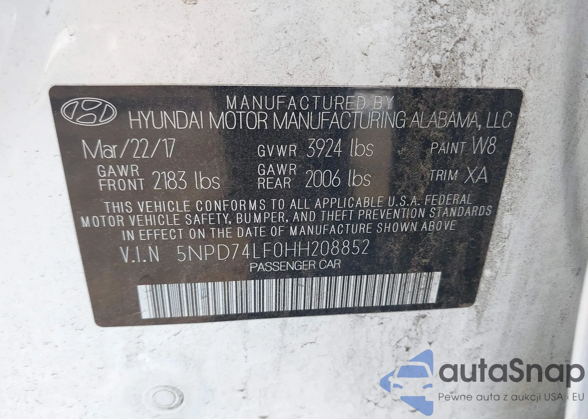 LOT: 43062780 VIN: 5NPD74LF0HH208852