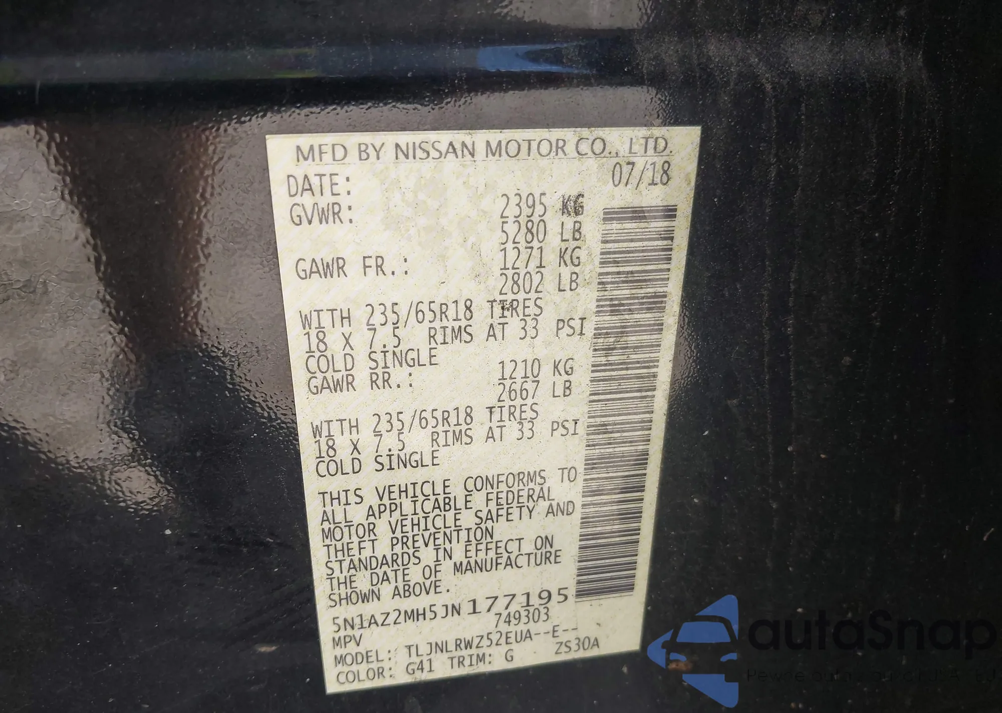 LOT: 43072382 VIN: 5N1AZ2MH5JN177195