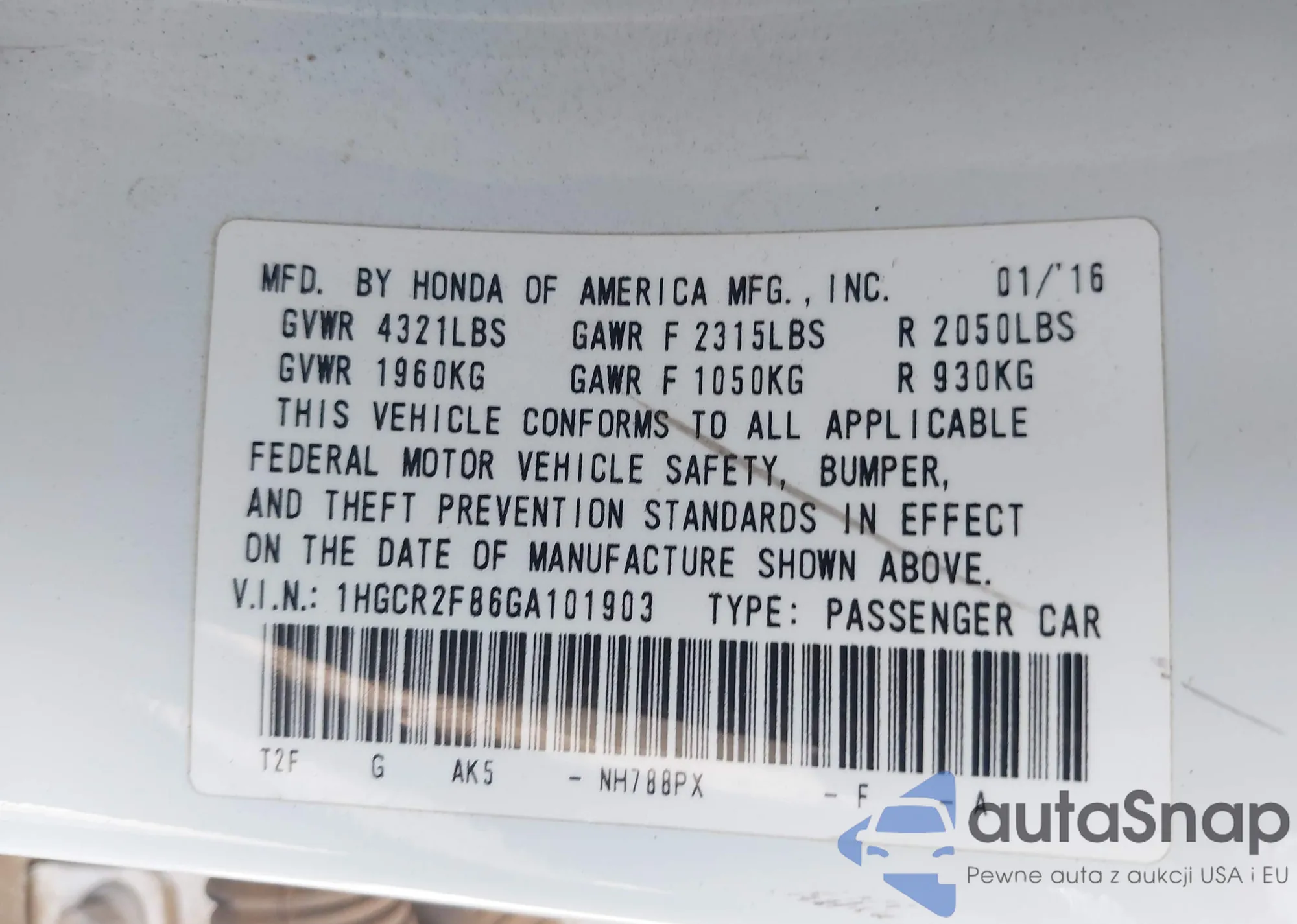 • VIN 1HGCR2F86GA101903