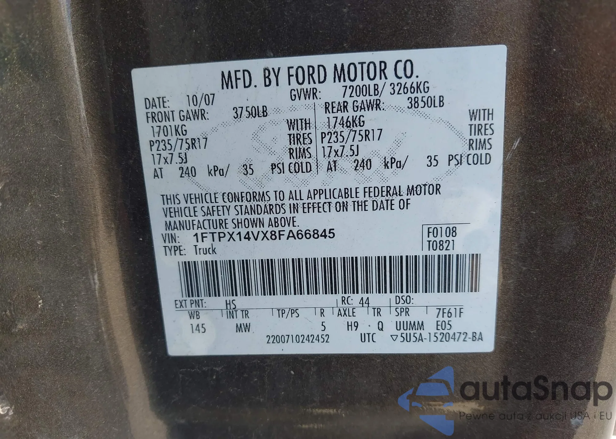• VIN 1FTPX14VX8FA66845