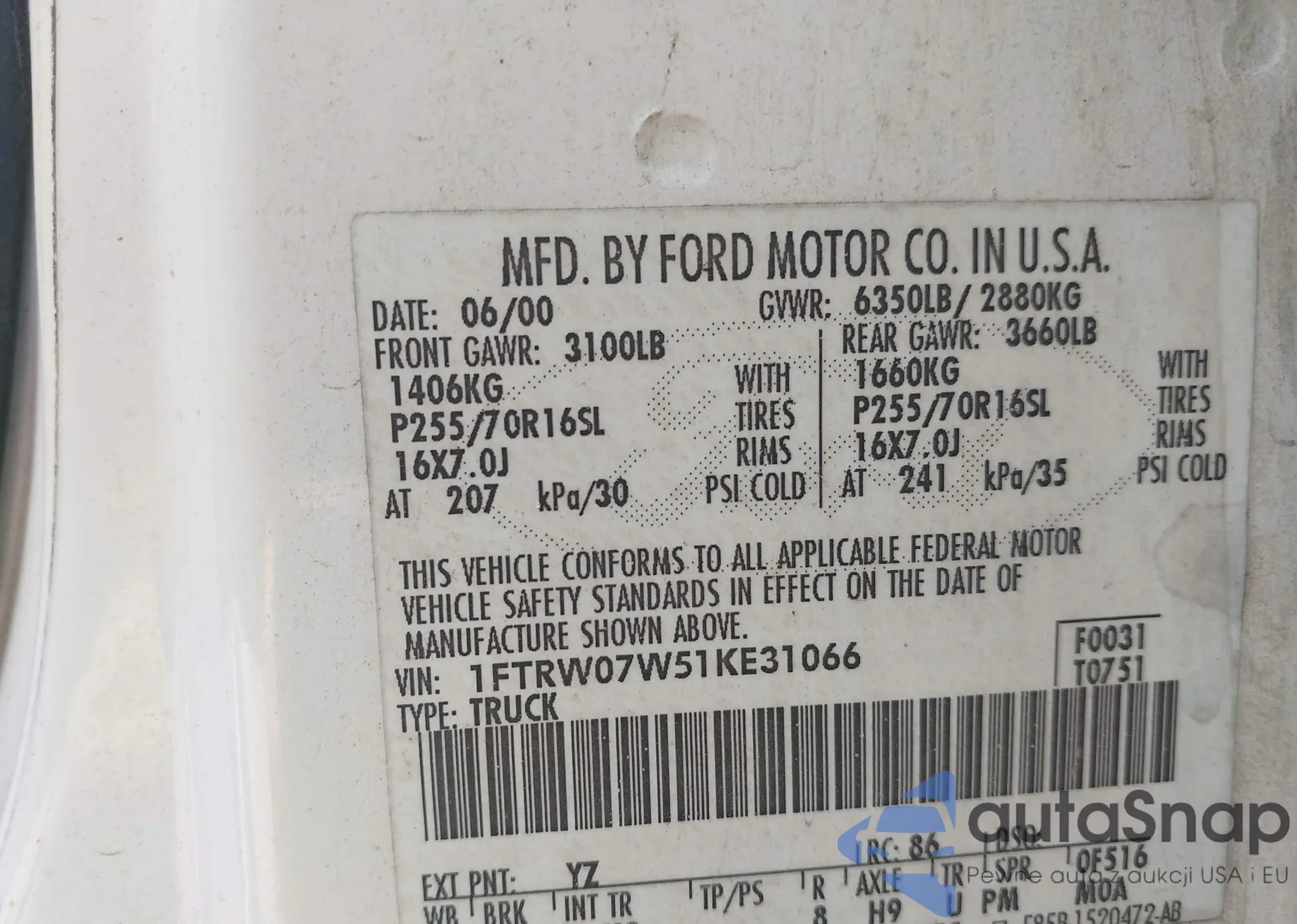 • VIN 1FTRW07W51KE31066