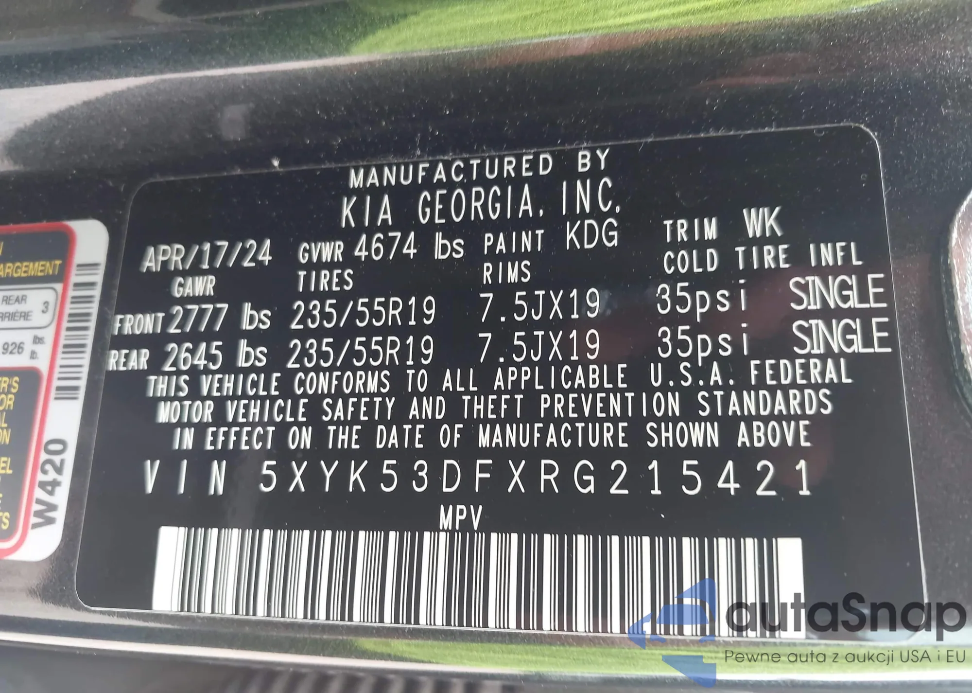 • VIN 5XYK53DFXRG215421