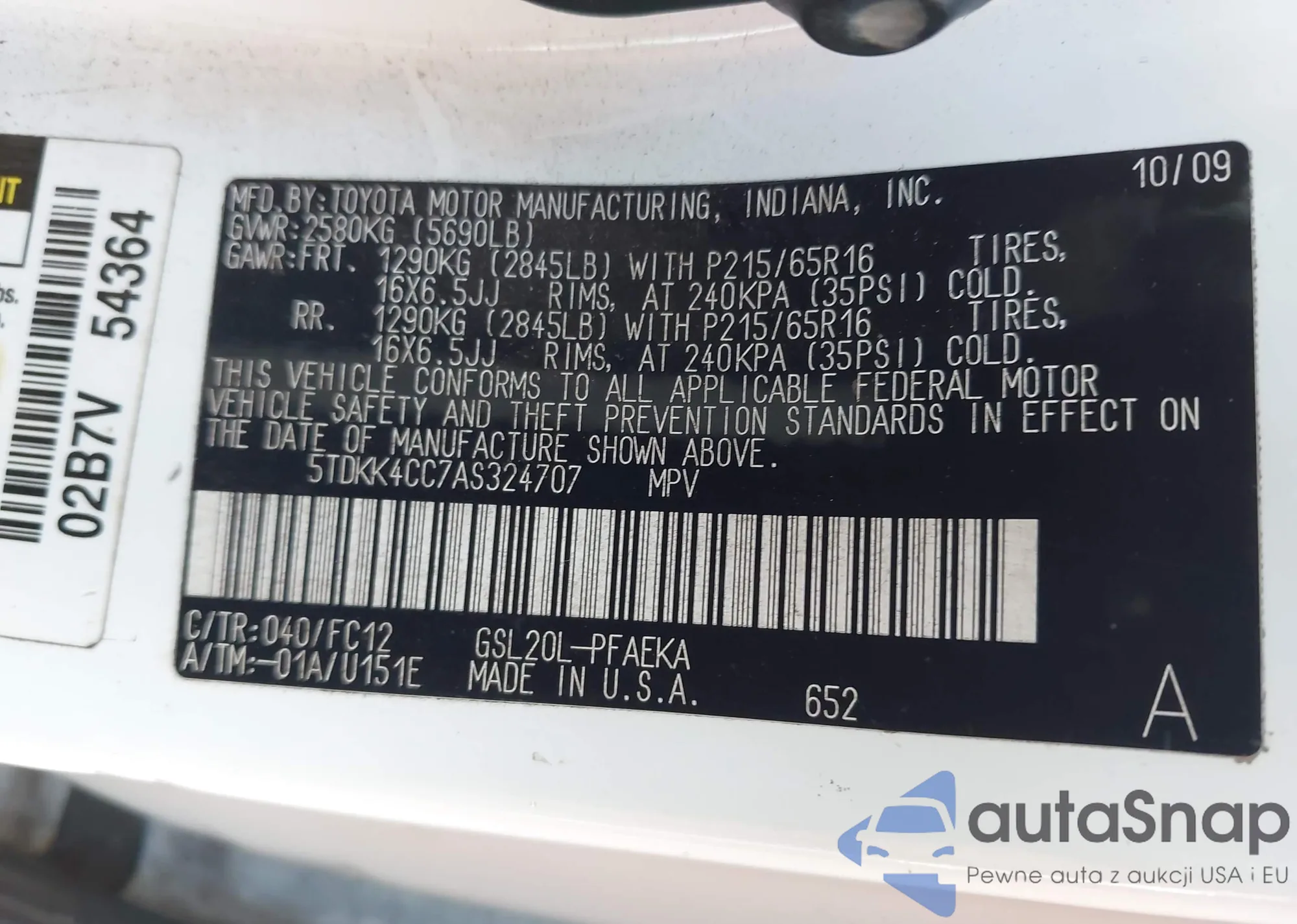 LOT: 42853782 VIN: 5TDKK4CC7AS324707