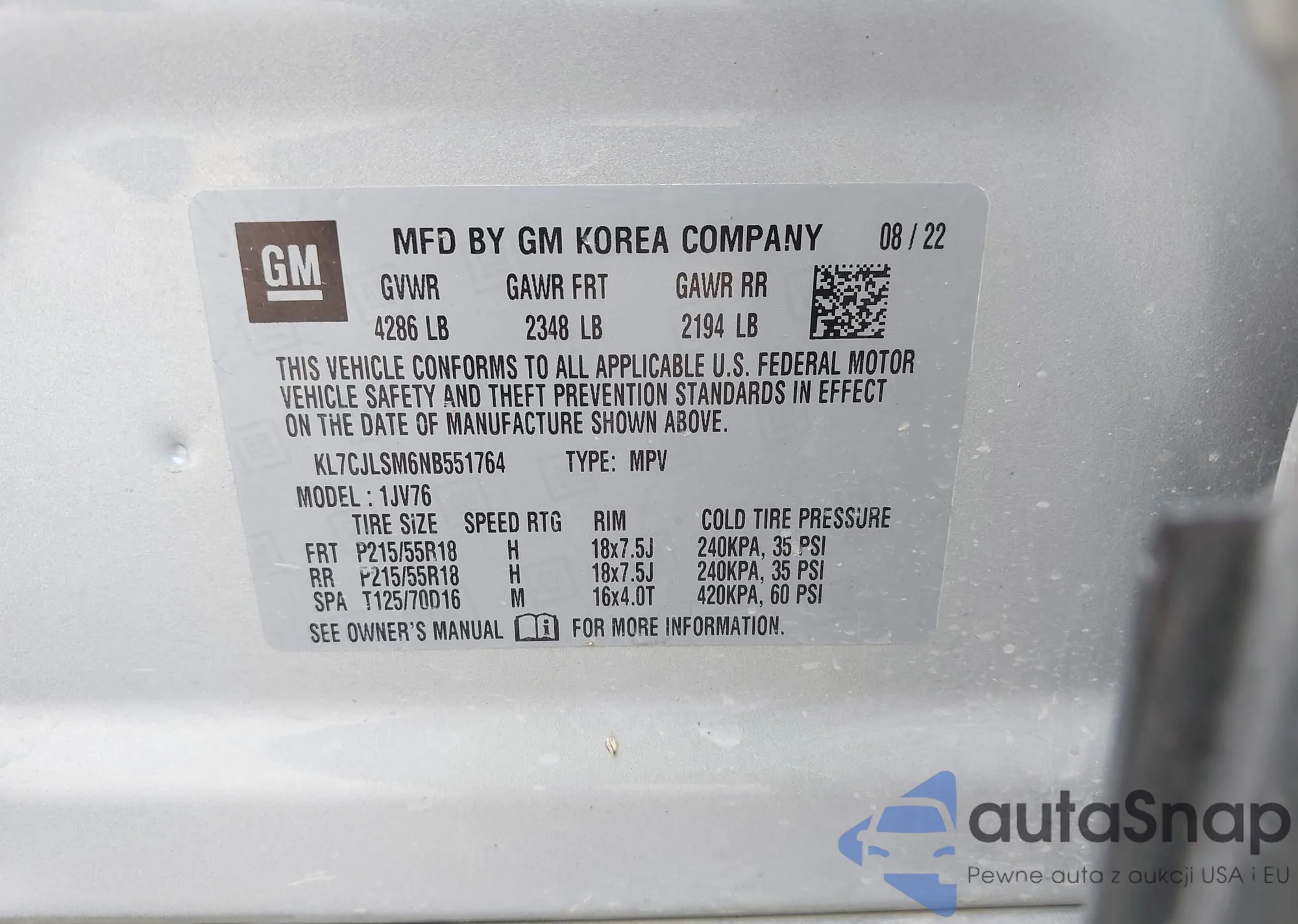 • VIN KL7CJLSM6NB551764