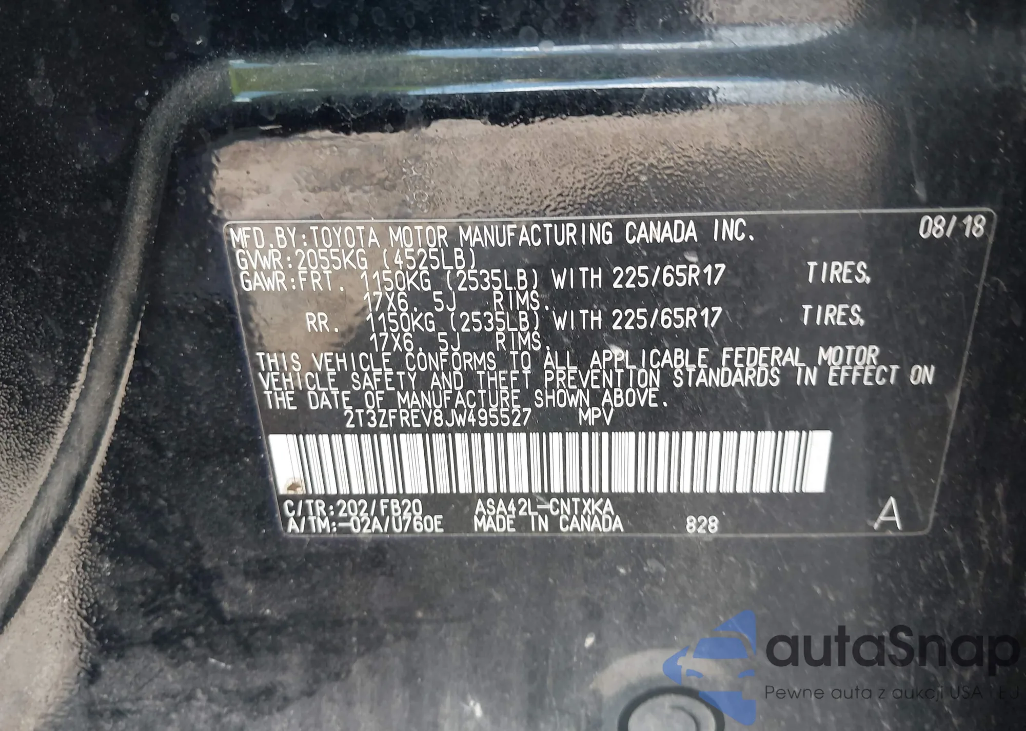• VIN 2T3ZFREV8JW495527