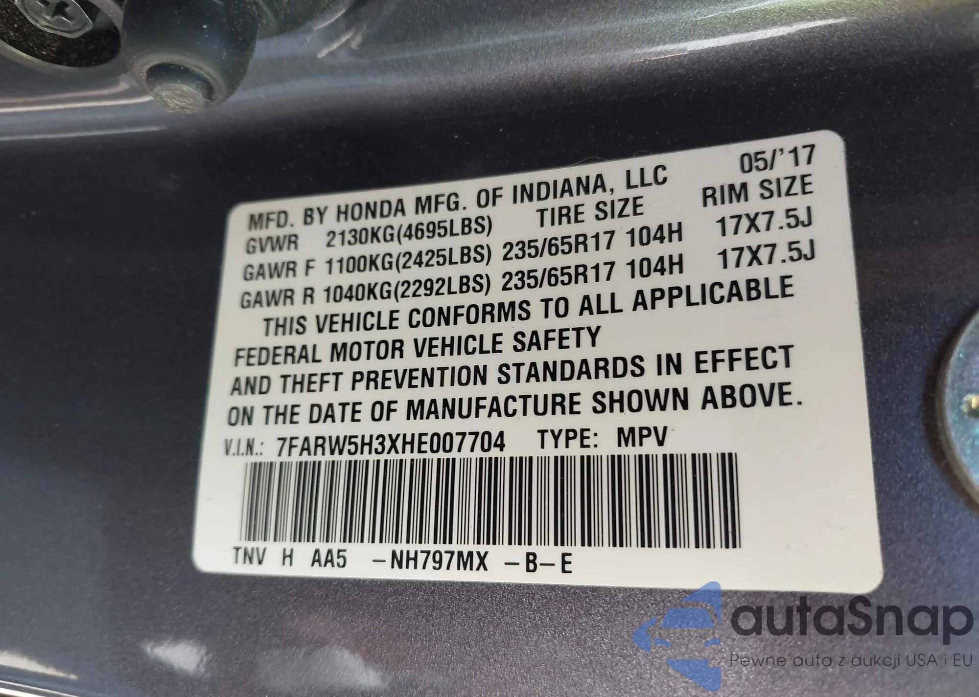 • VIN 7FARW5H3XHE007704