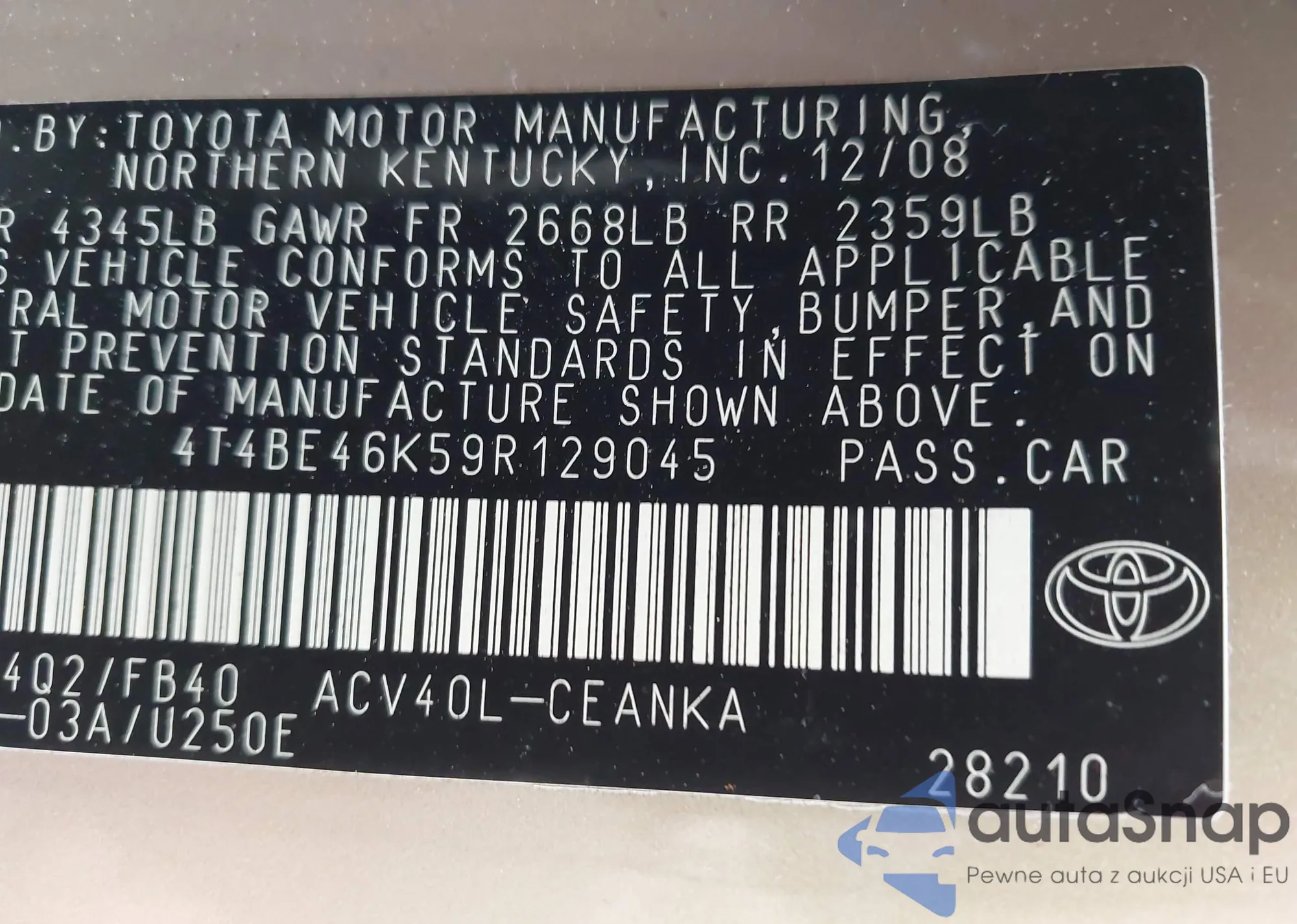 LOT: 43401184 VIN: 4T4BE46K59R129045