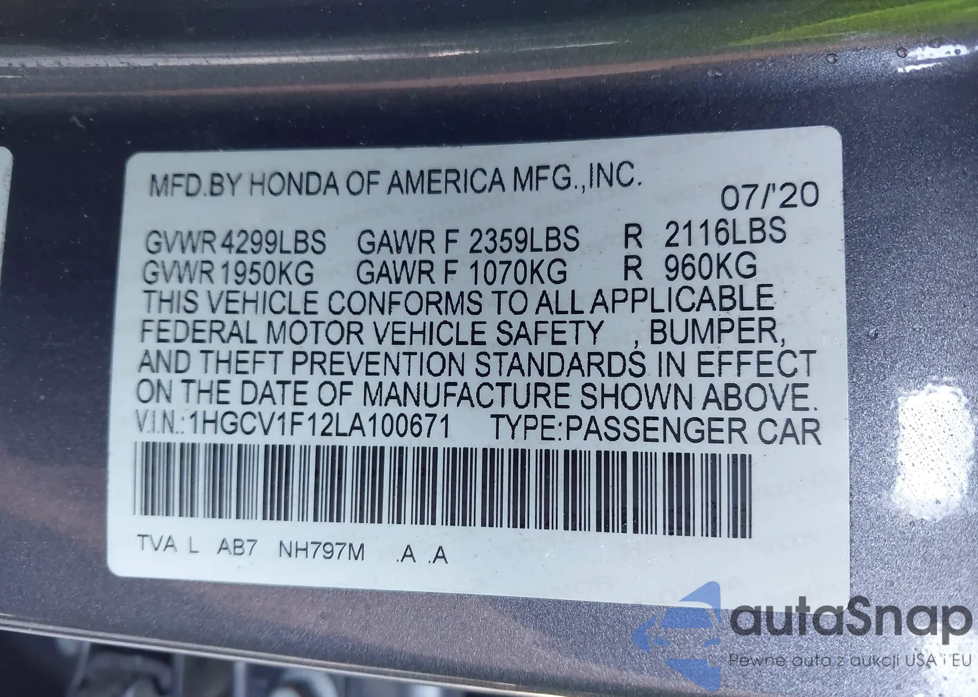 LOT: 43136227 VIN: 1HGCV1F12LA100671