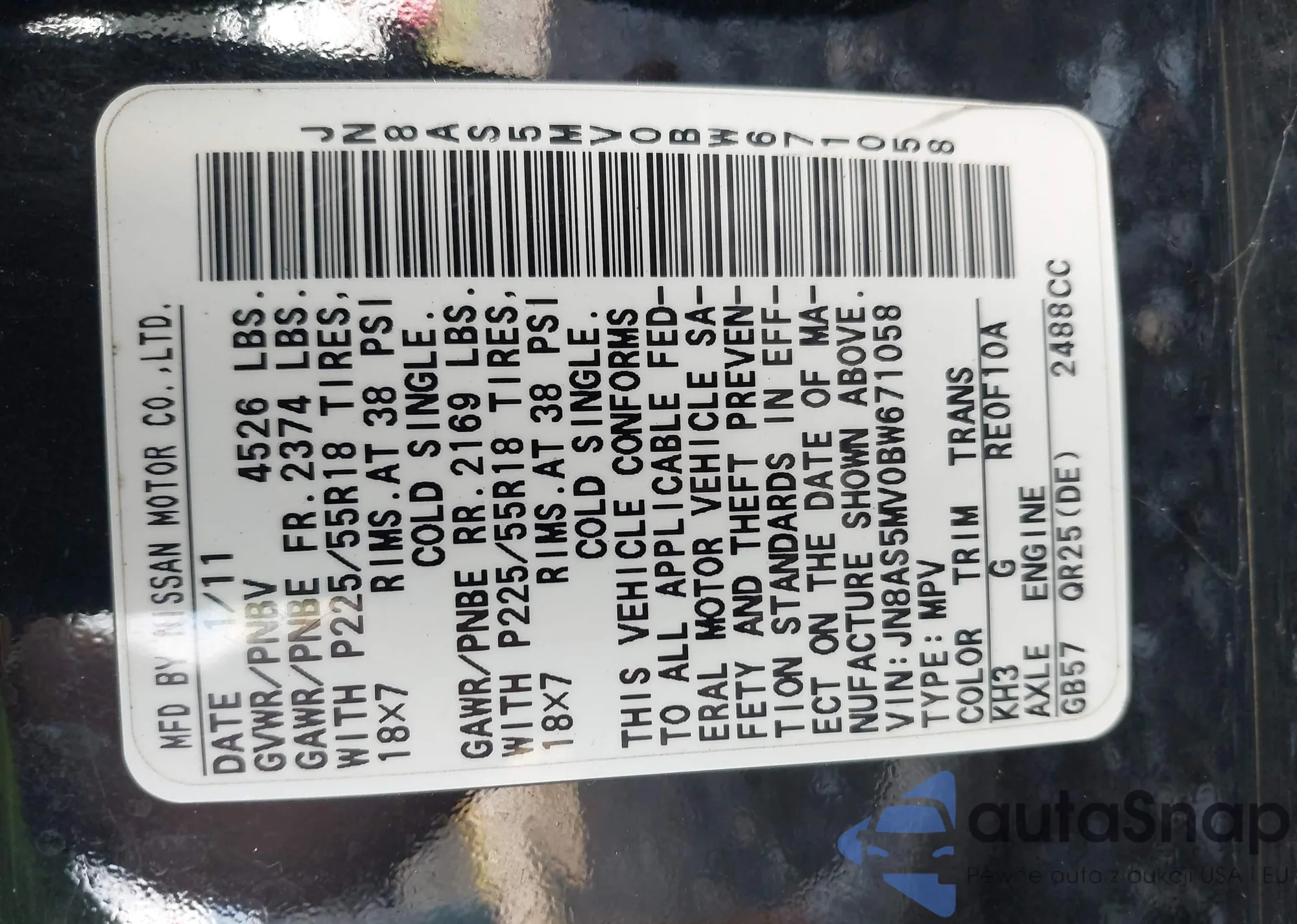 • VIN JN8AS5MV0BW671058