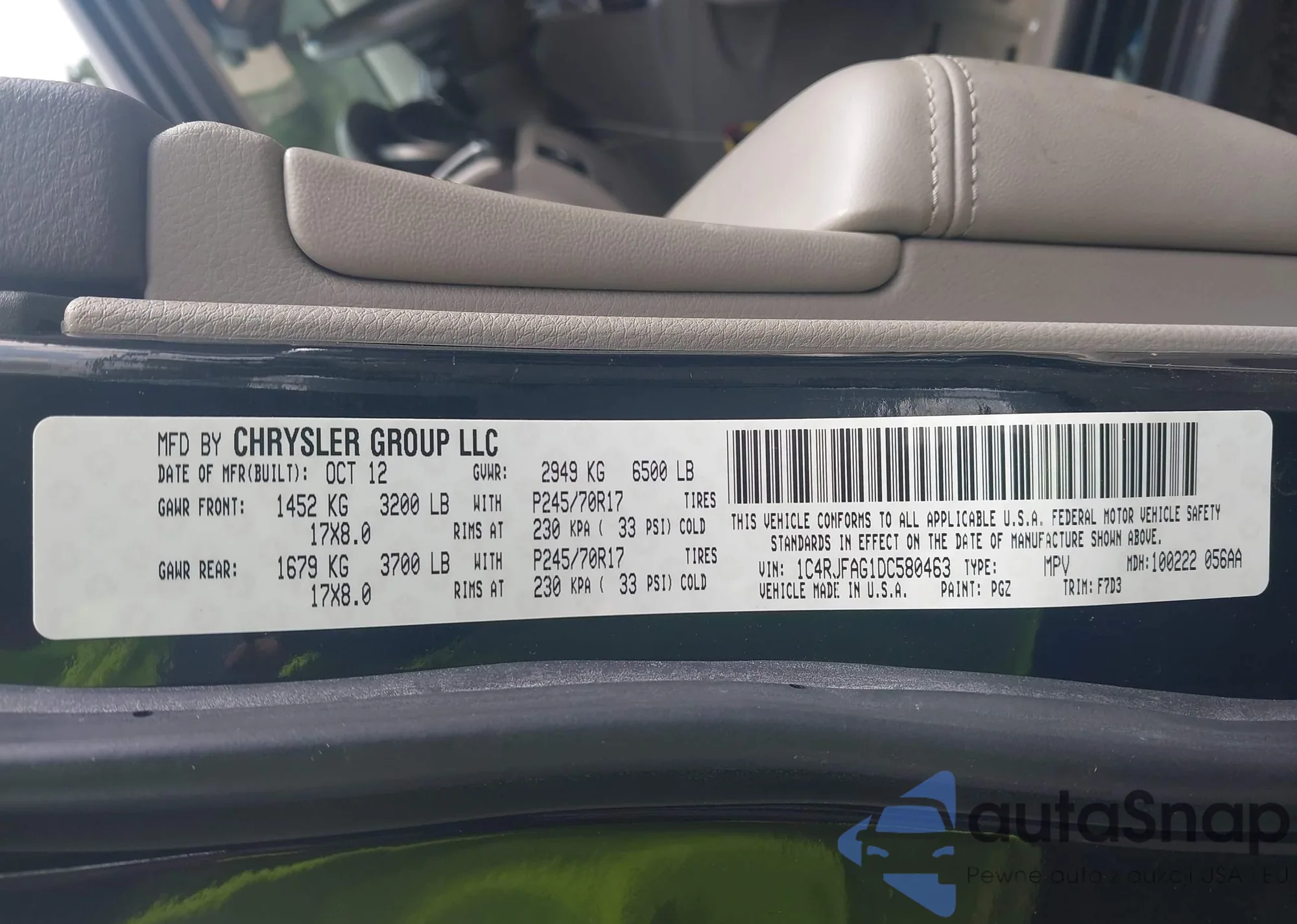 • VIN 1C4RJFAG1DC580463