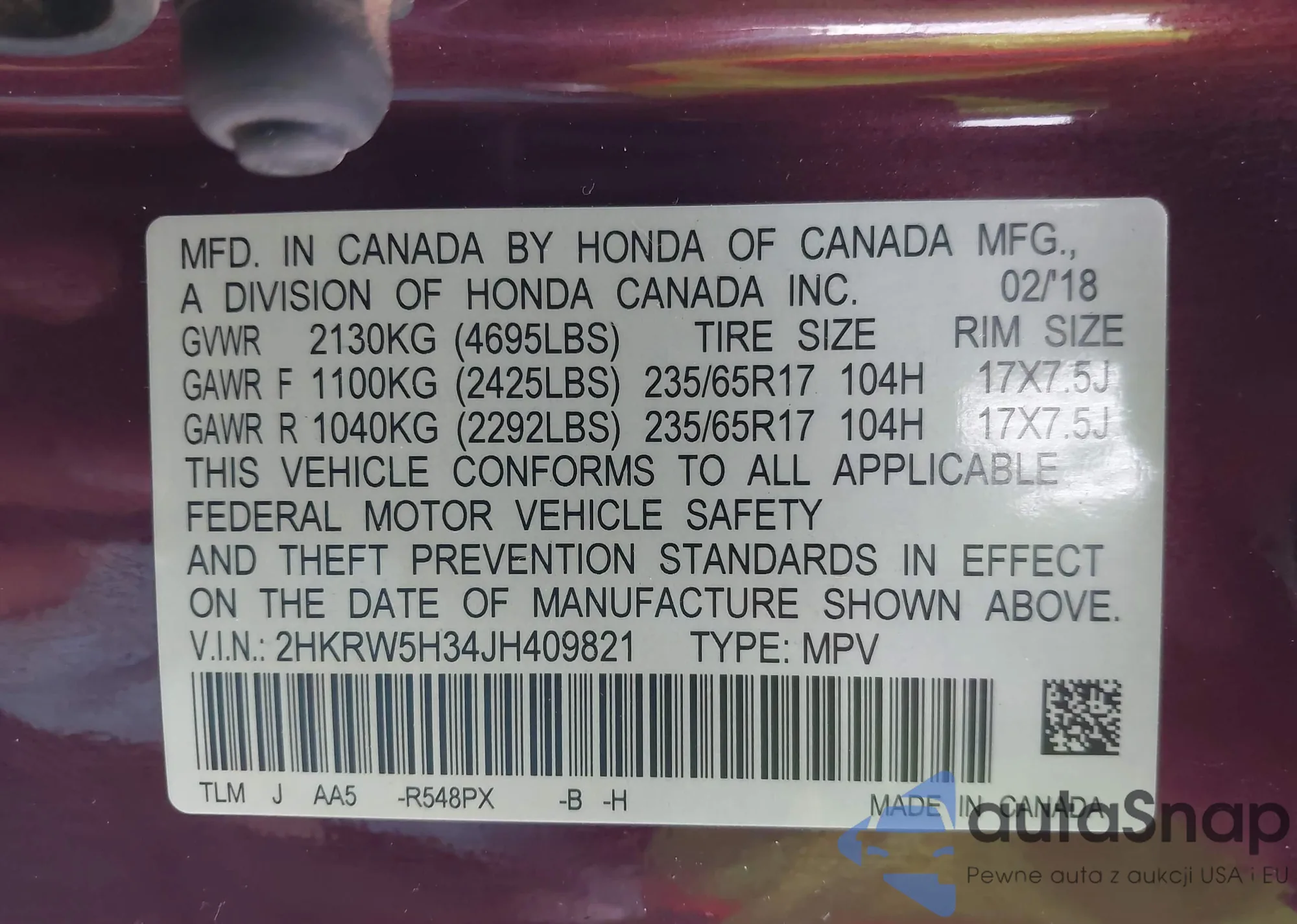 • VIN 2HKRW5H34JH409821