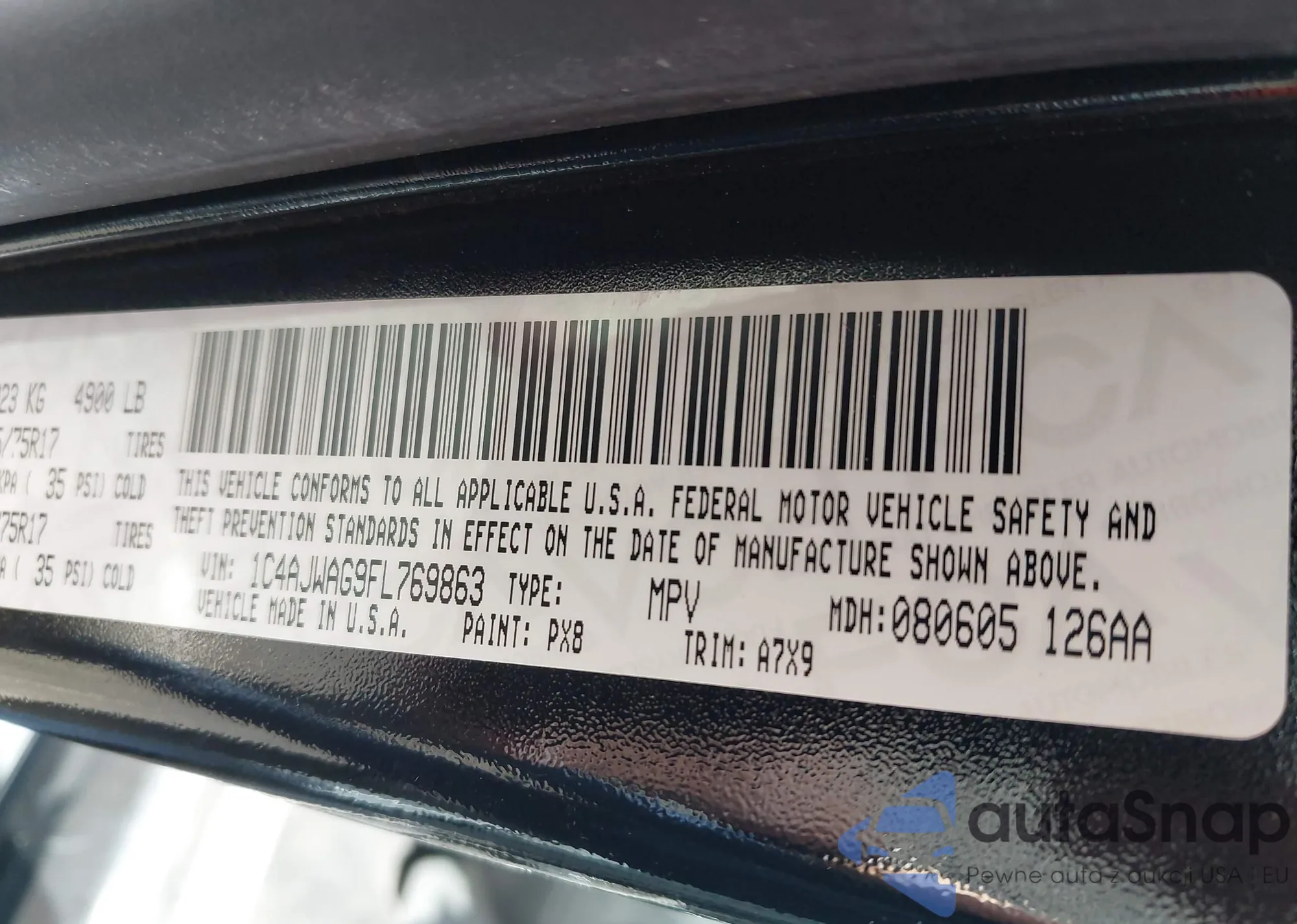 • VIN 1C4AJWAG9FL769863