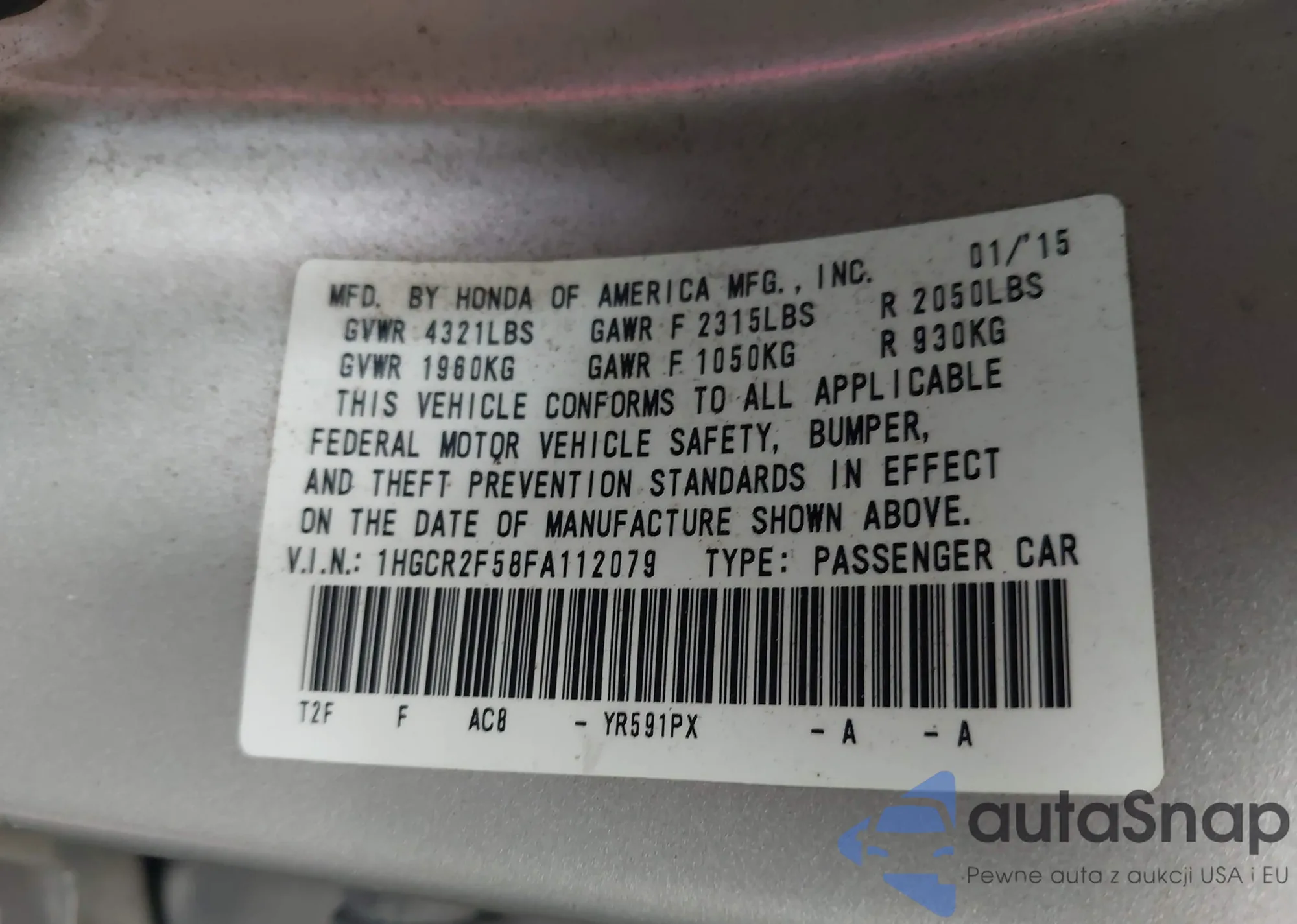 LOT: 43327736 VIN: 1HGCR2F58FA112079