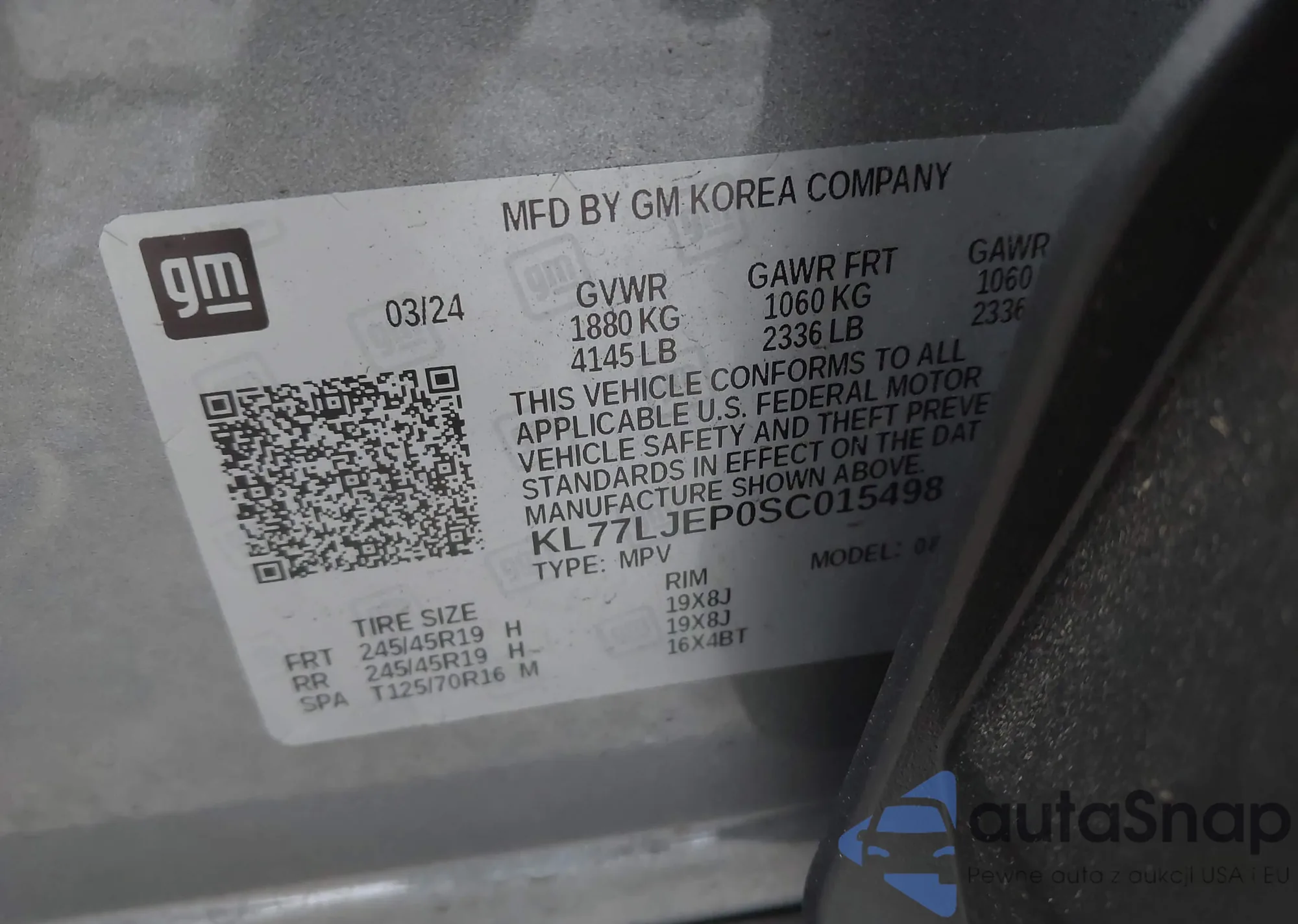 LOT: 43372161 VIN: KL77LJEP0SC015498