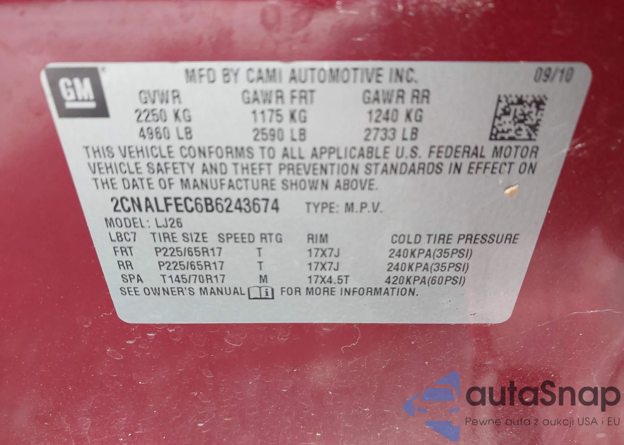 LOT: 43382917 VIN: 2CNALFEC6B6243674