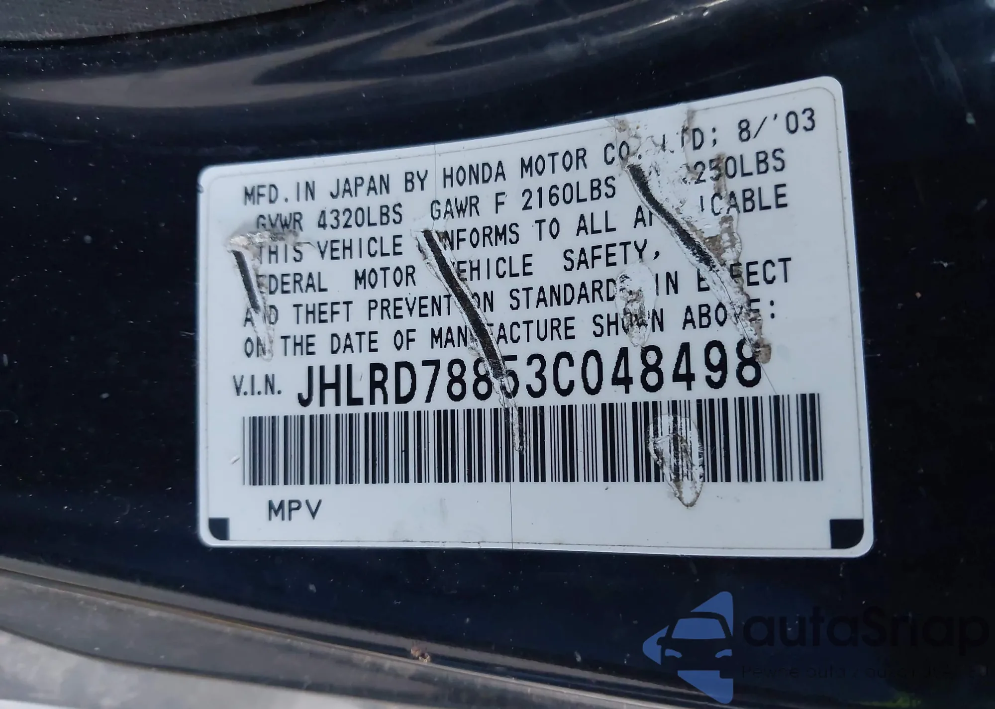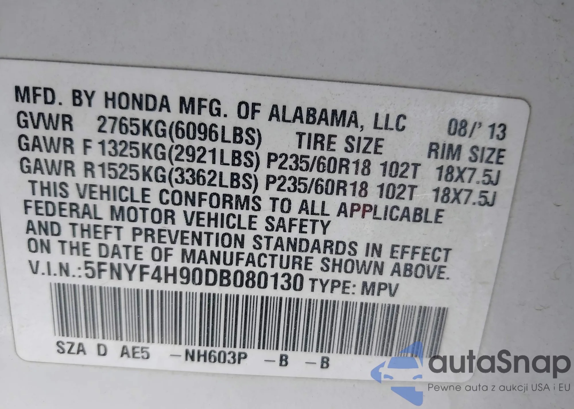 • VIN 5FNYF4H90DB080130