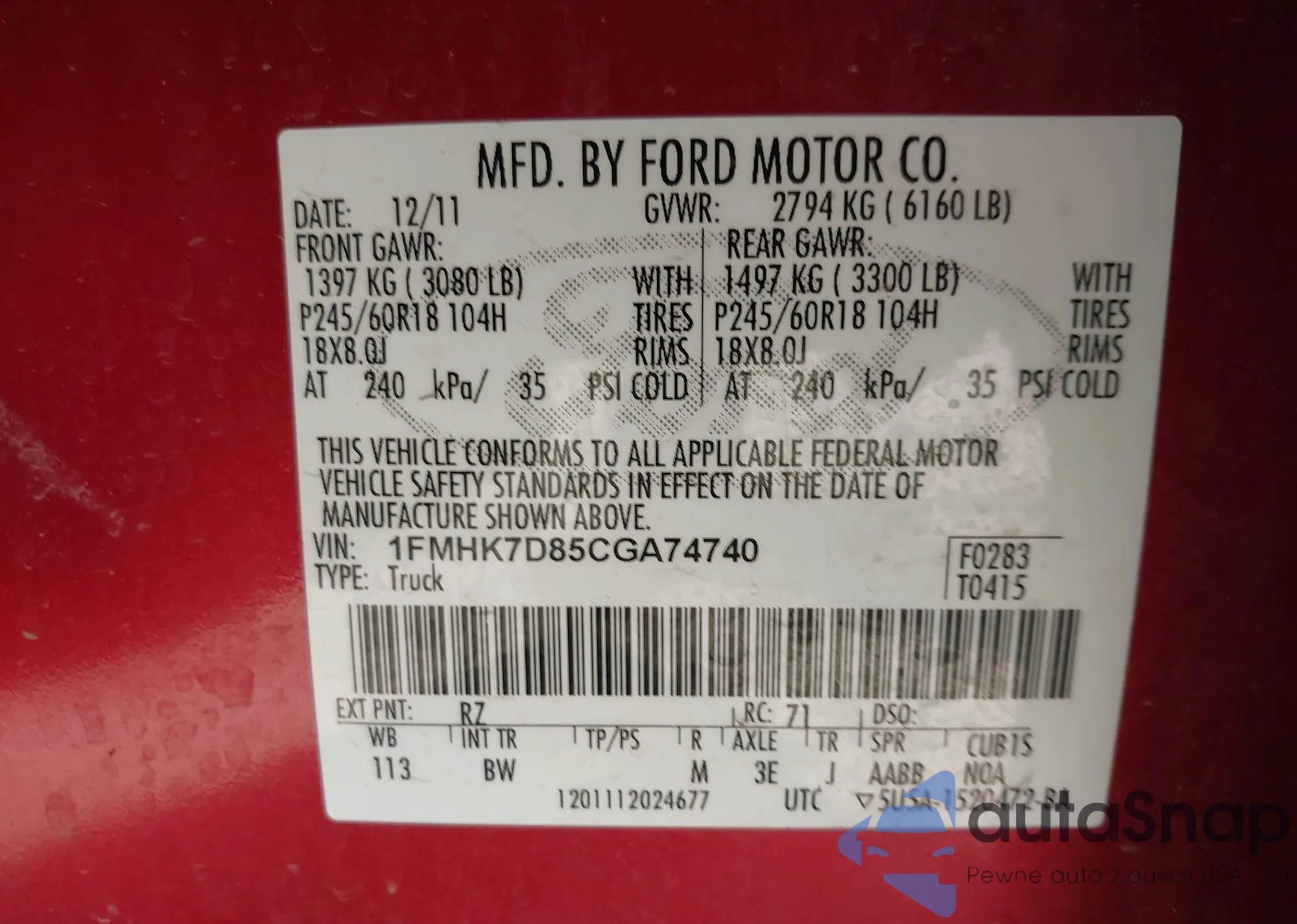 LOT: 43360674 VIN: 1FMHK7D85CGA74740