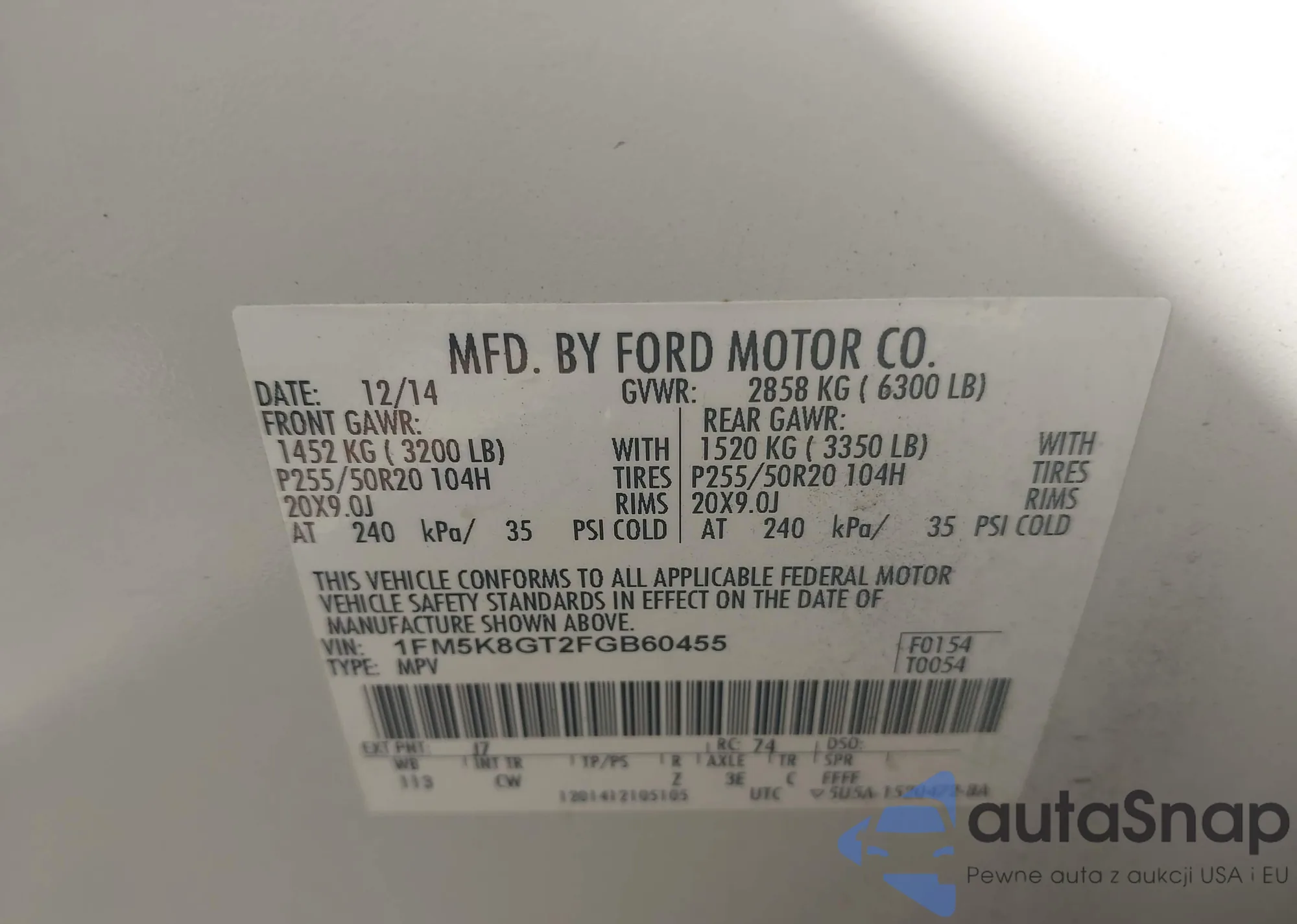 LOT: 43413025 VIN: 1FM5K8GT2FGB60455