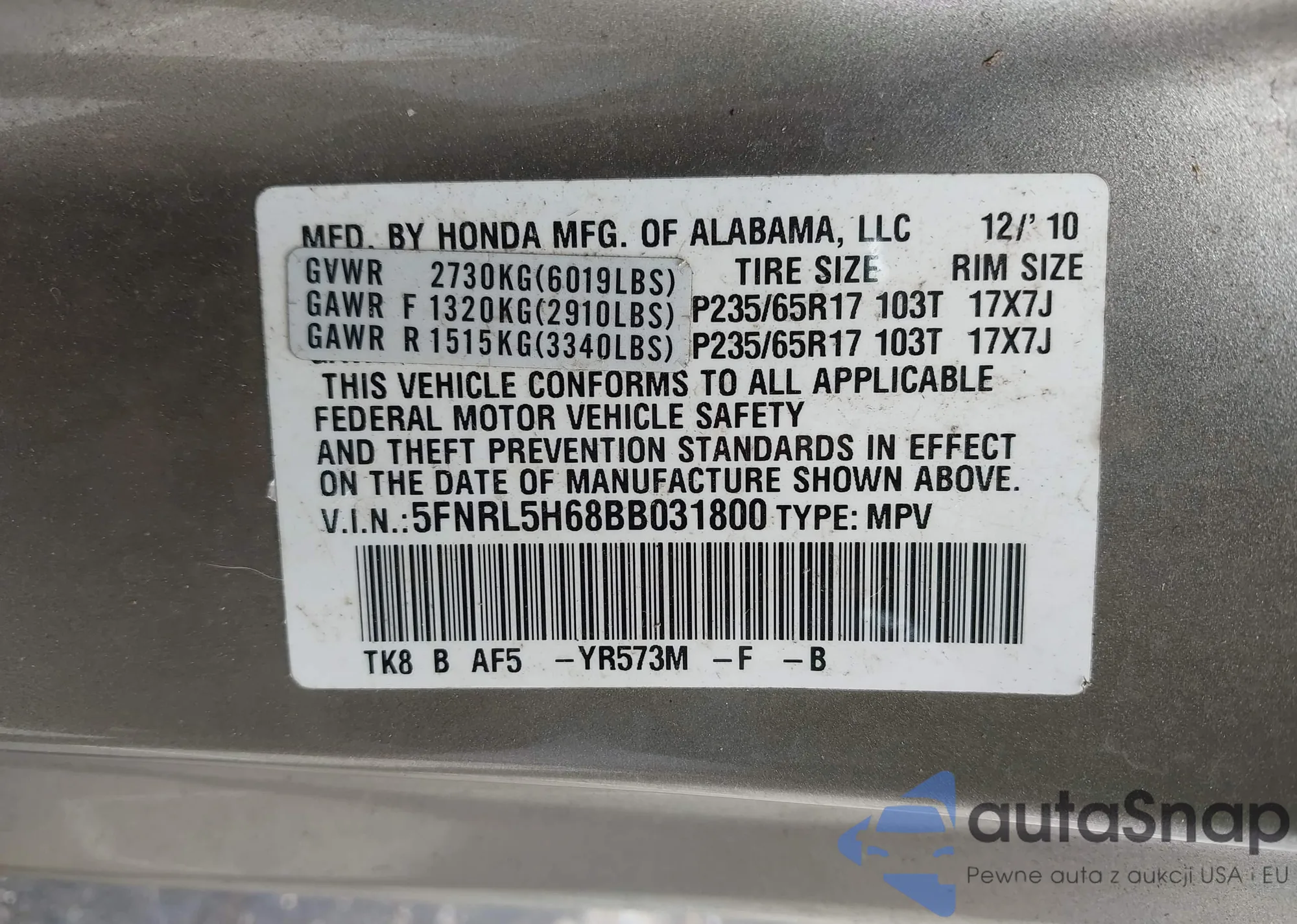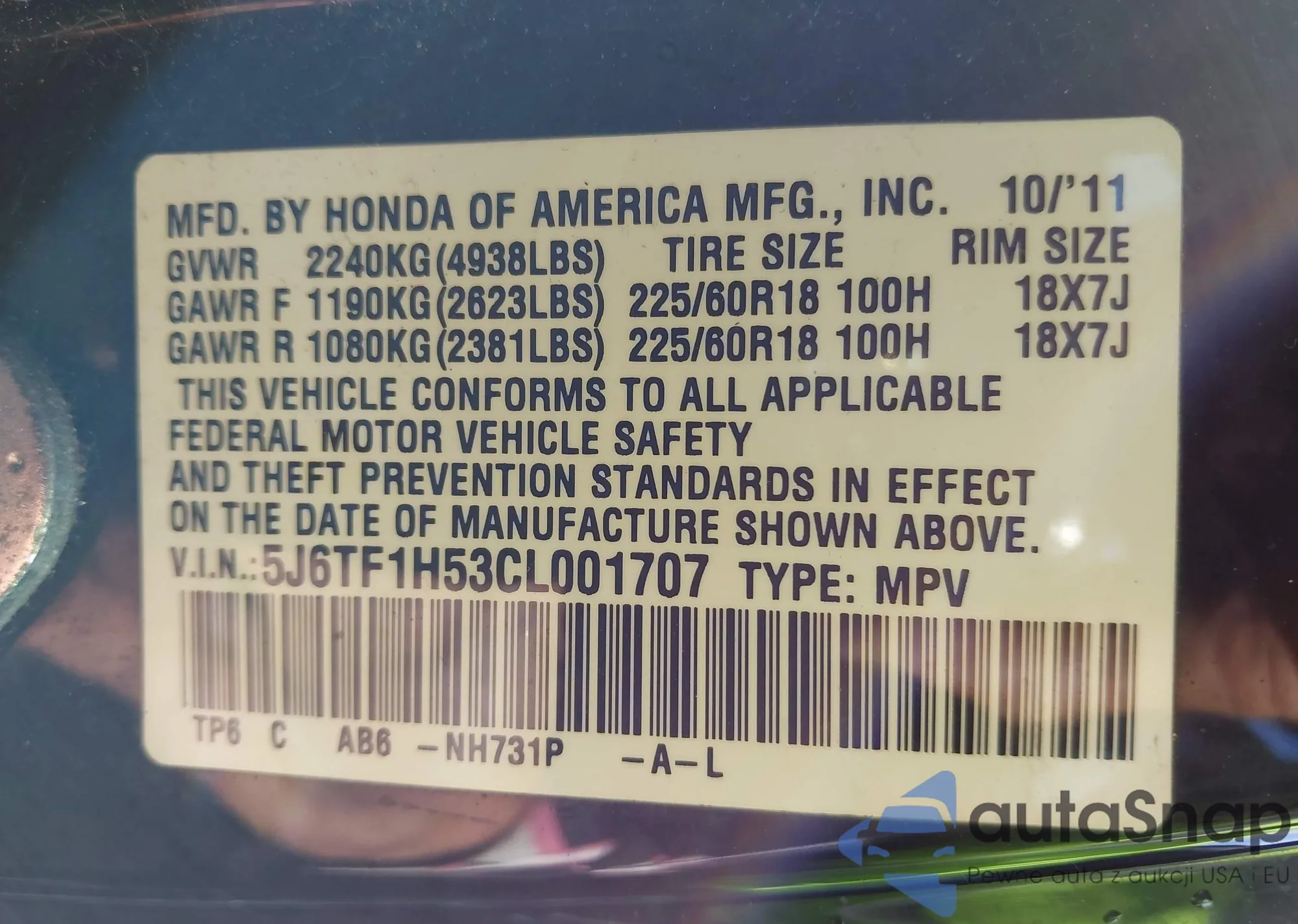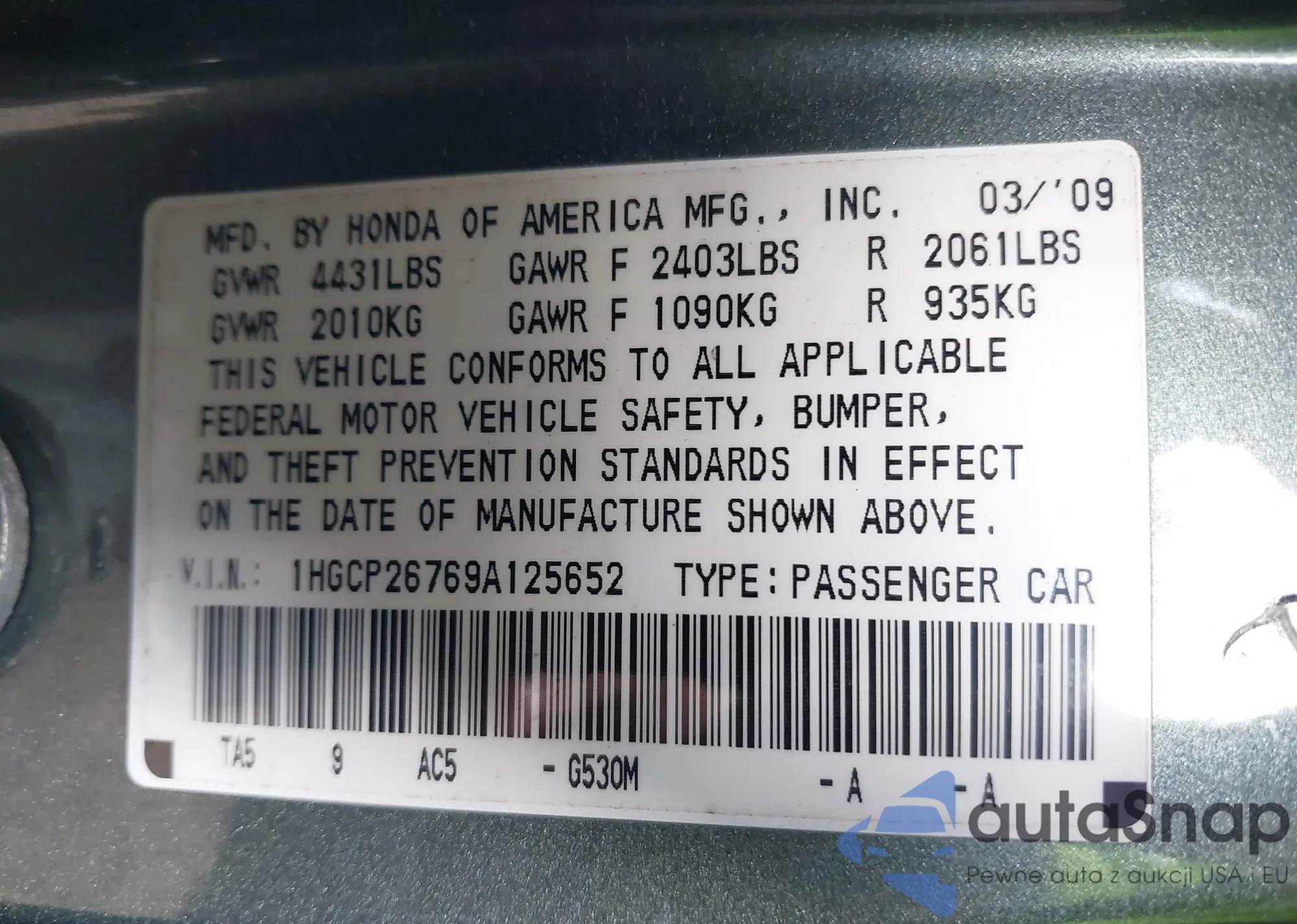 LOT: 43374144 VIN: 1HGCP26769A125652