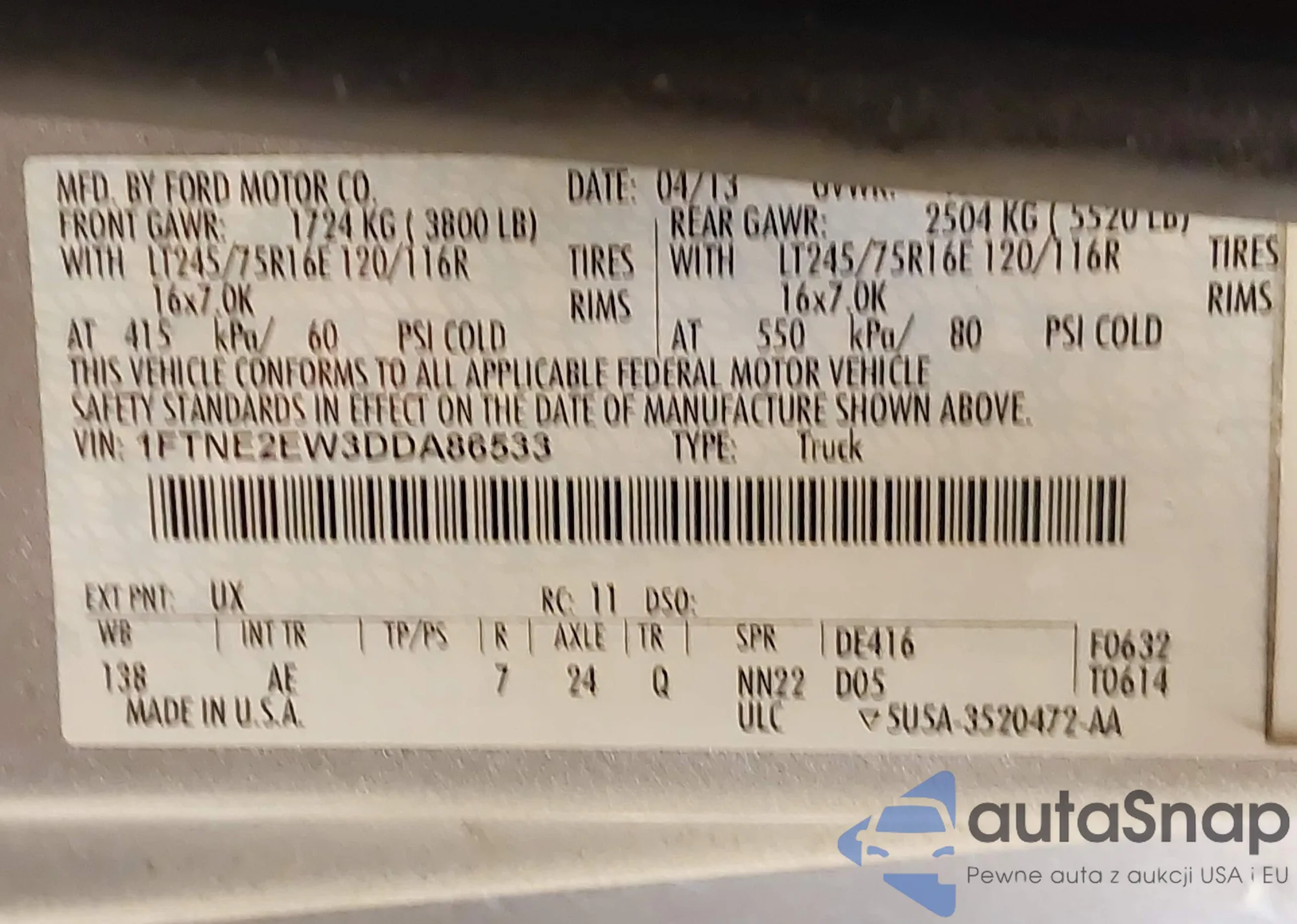LOT: 43399640 VIN: KMHDH4AE6DU009890