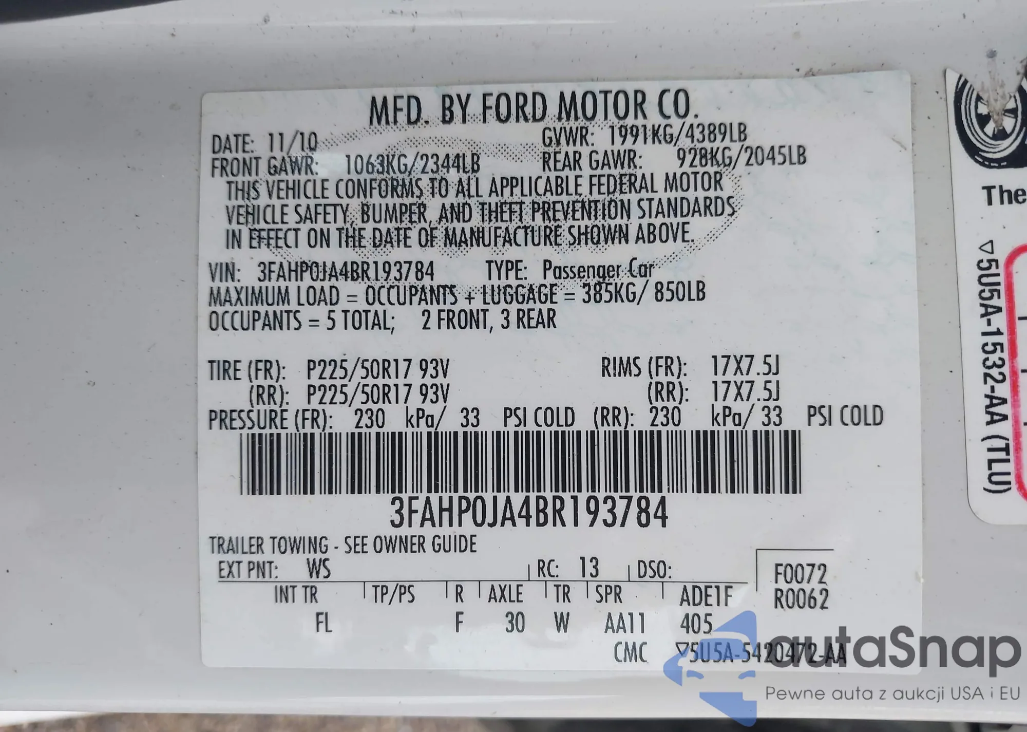 • VIN 3FAHP0JA4BR193784