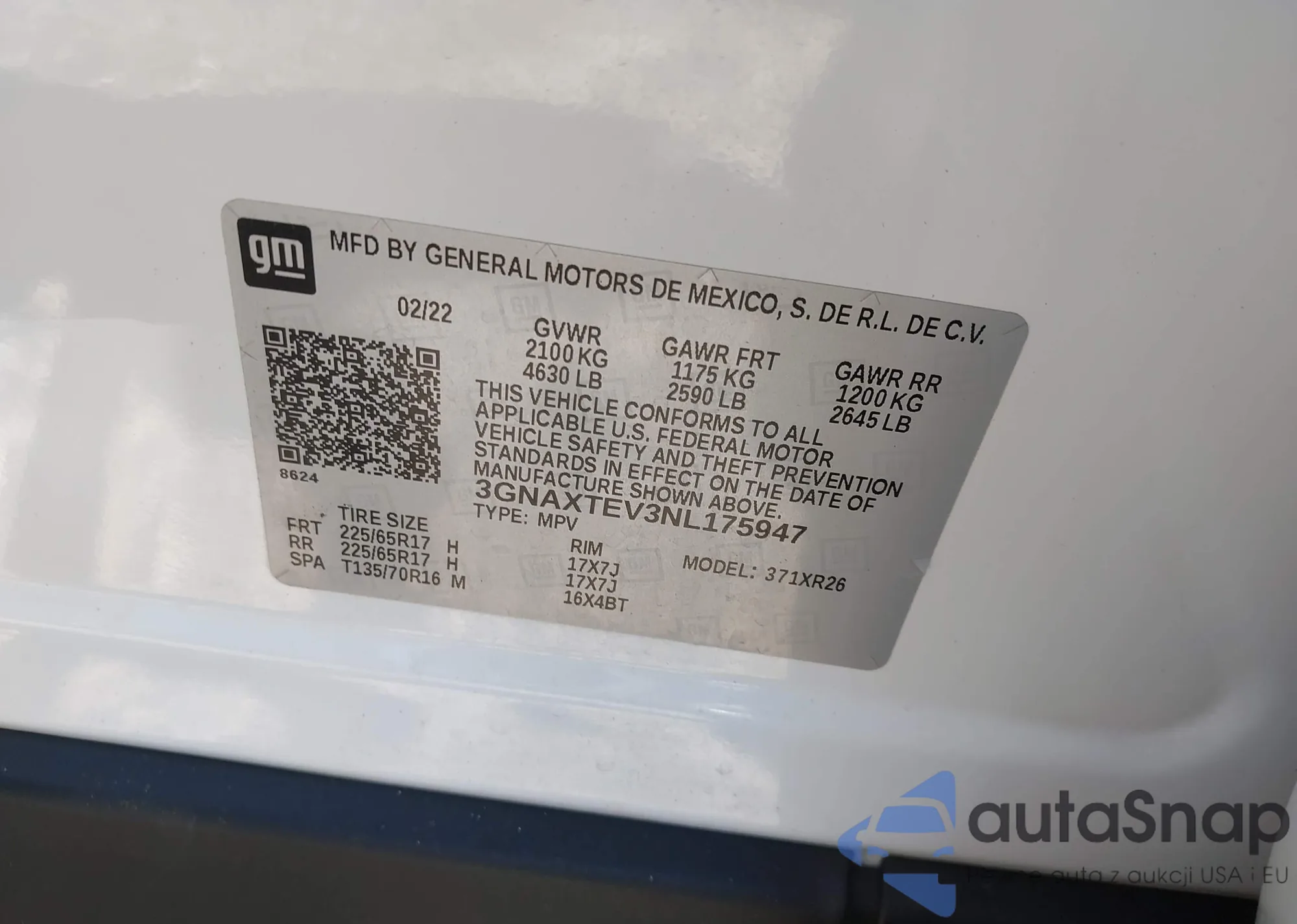 LOT: 42804190 VIN: 3GNAXTEV3NL175947