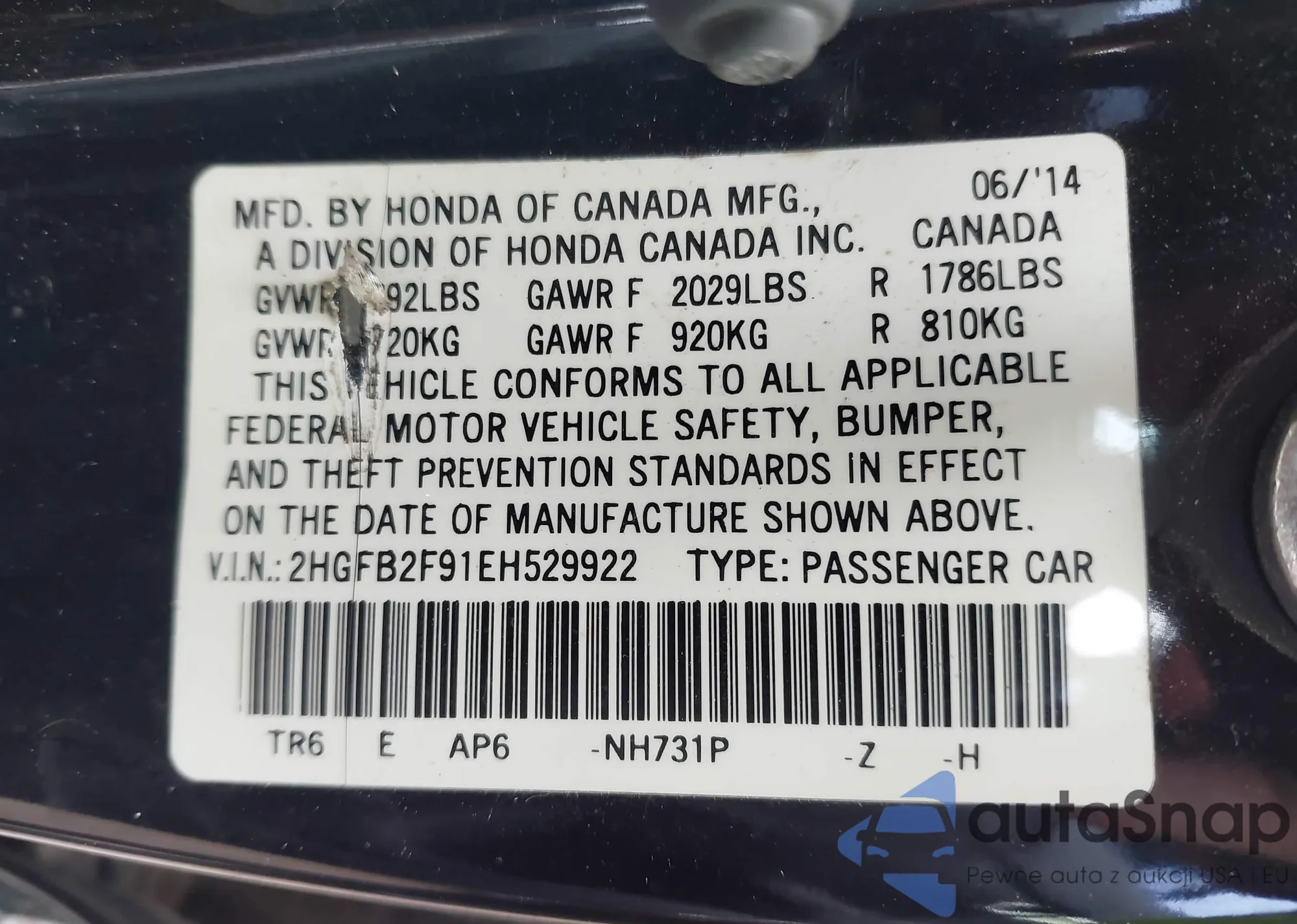 • VIN 2HGFB2F91EH529922