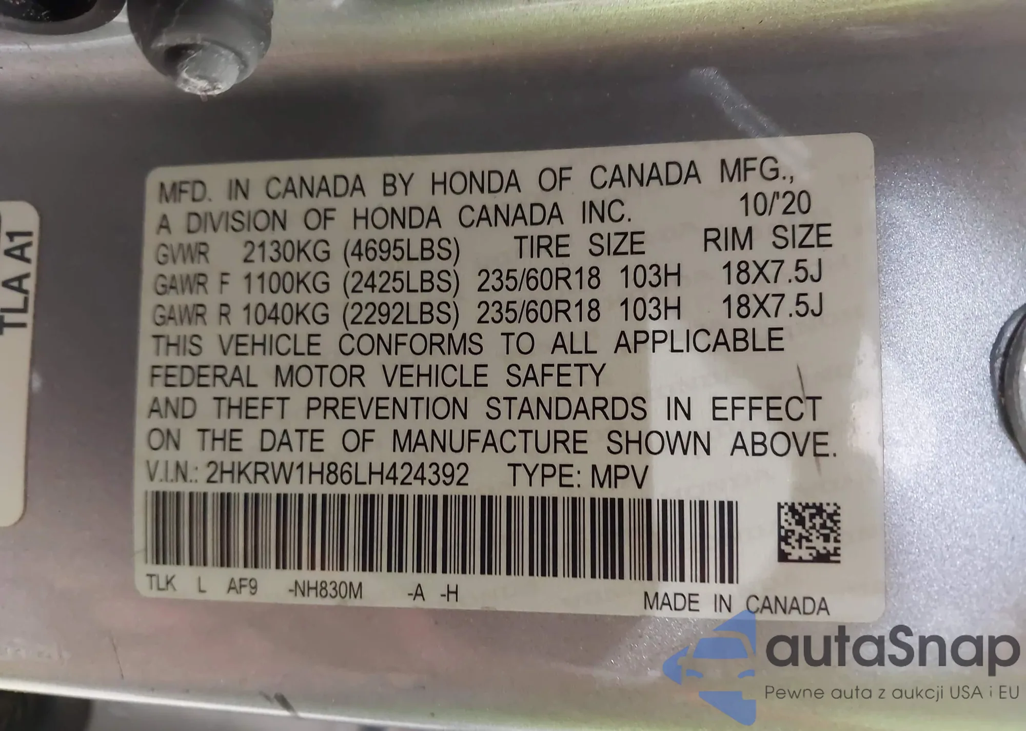 • VIN 2HKRW1H86LH424392