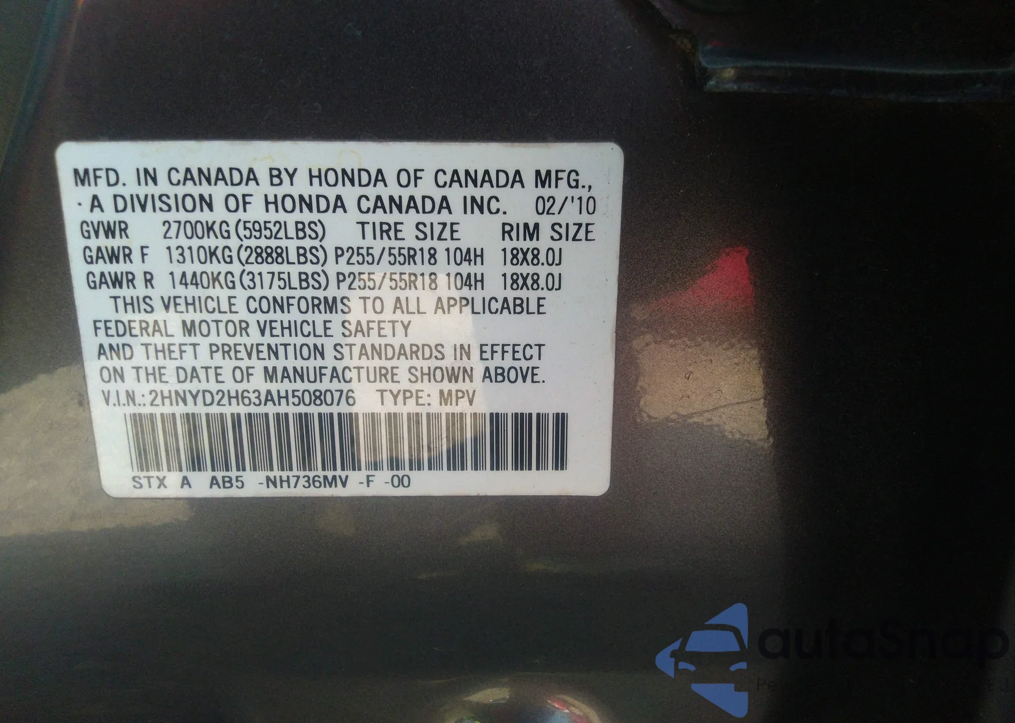 • VIN 2HNYD2H63AH508076