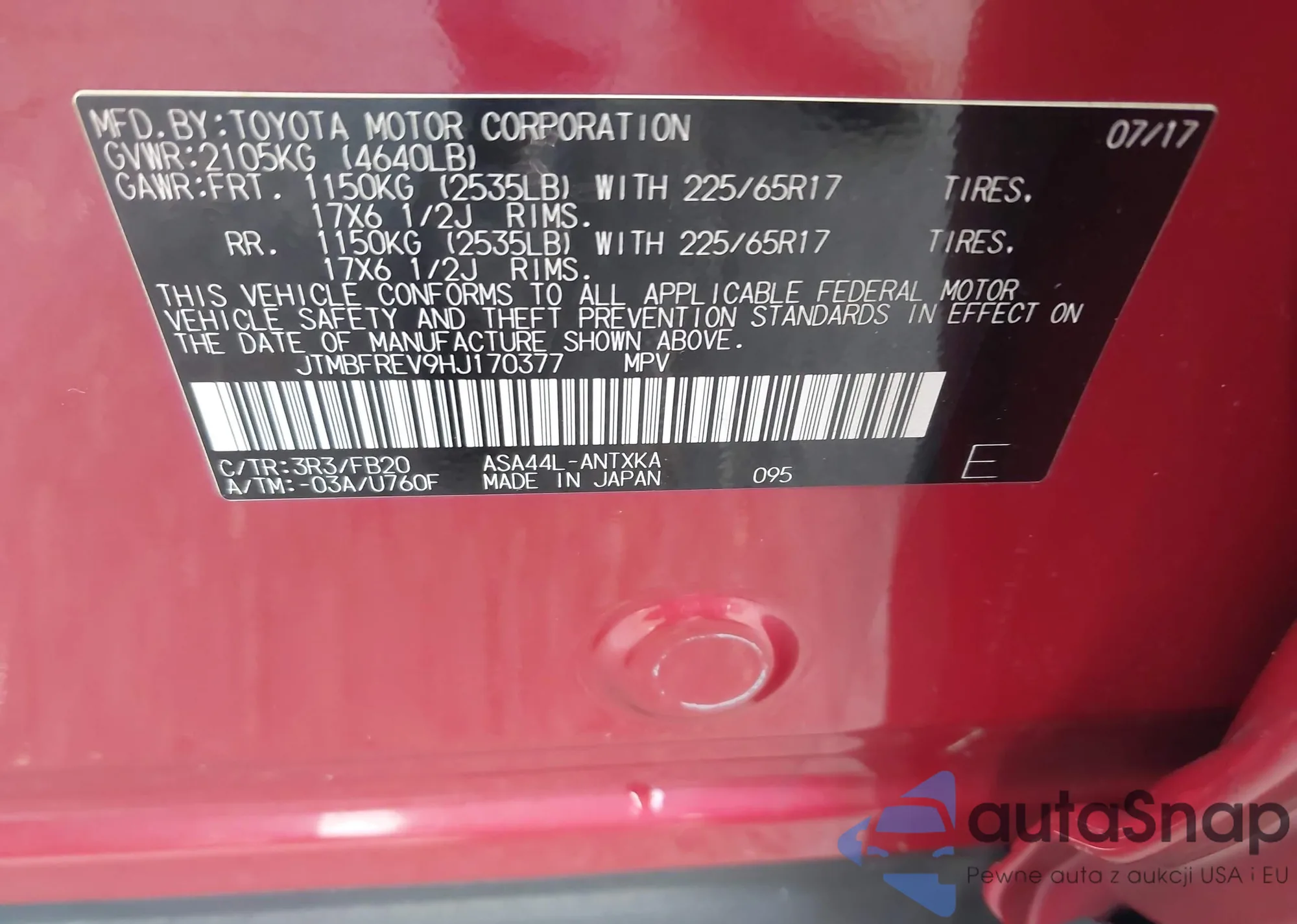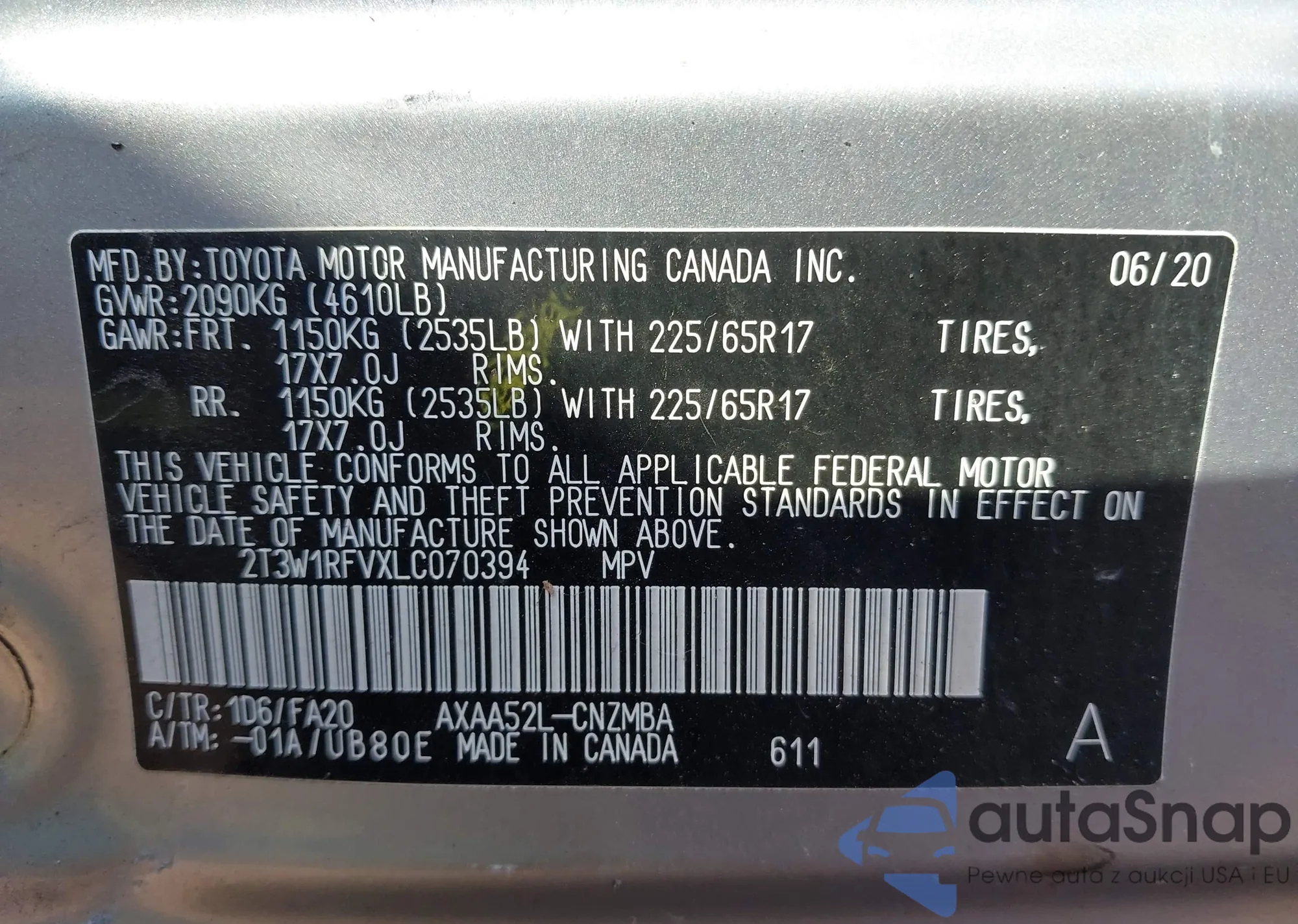 LOT: 43260617 VIN: 2T3W1RFVXLC070394