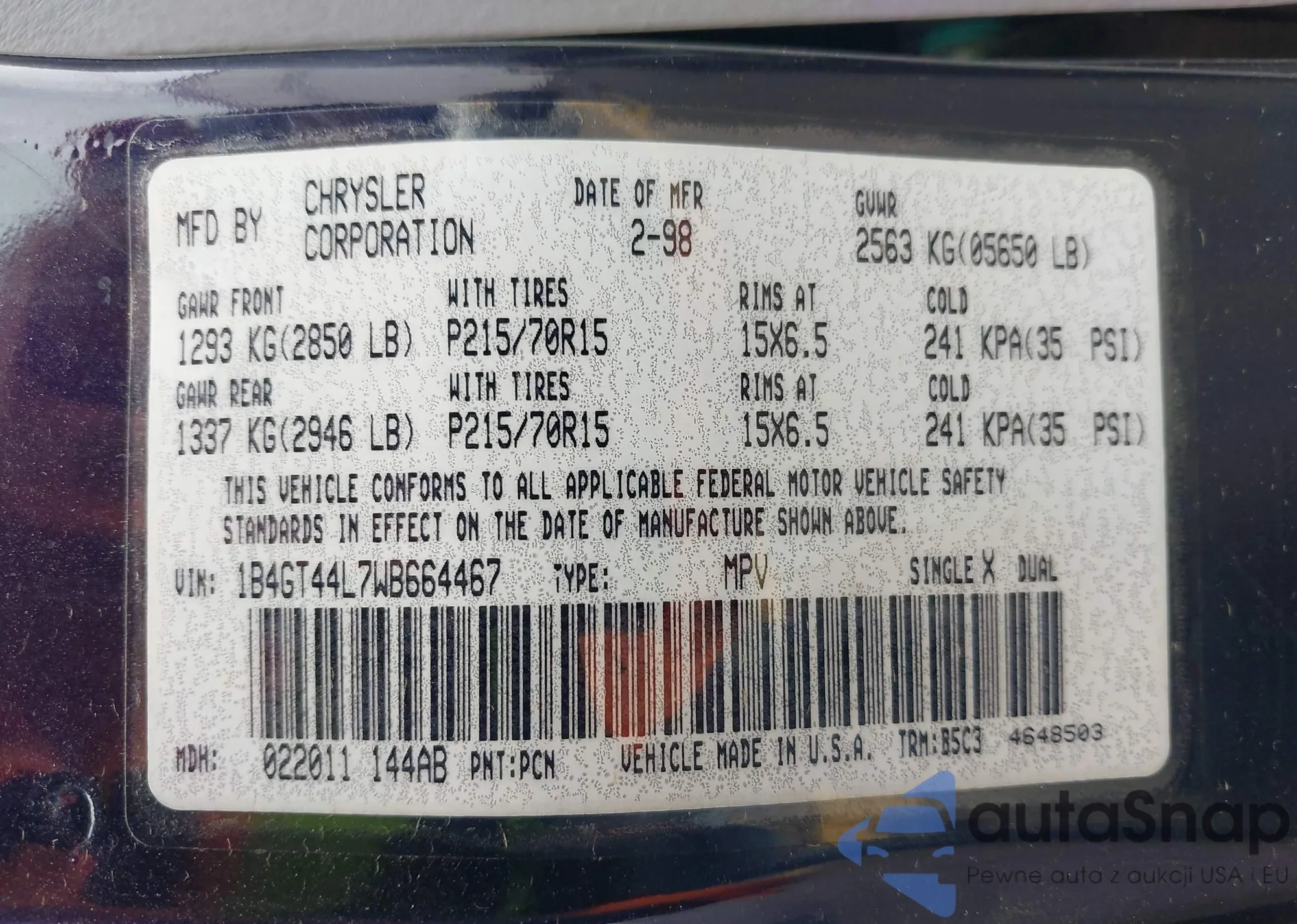 • VIN 1B4GT44L7WB664467