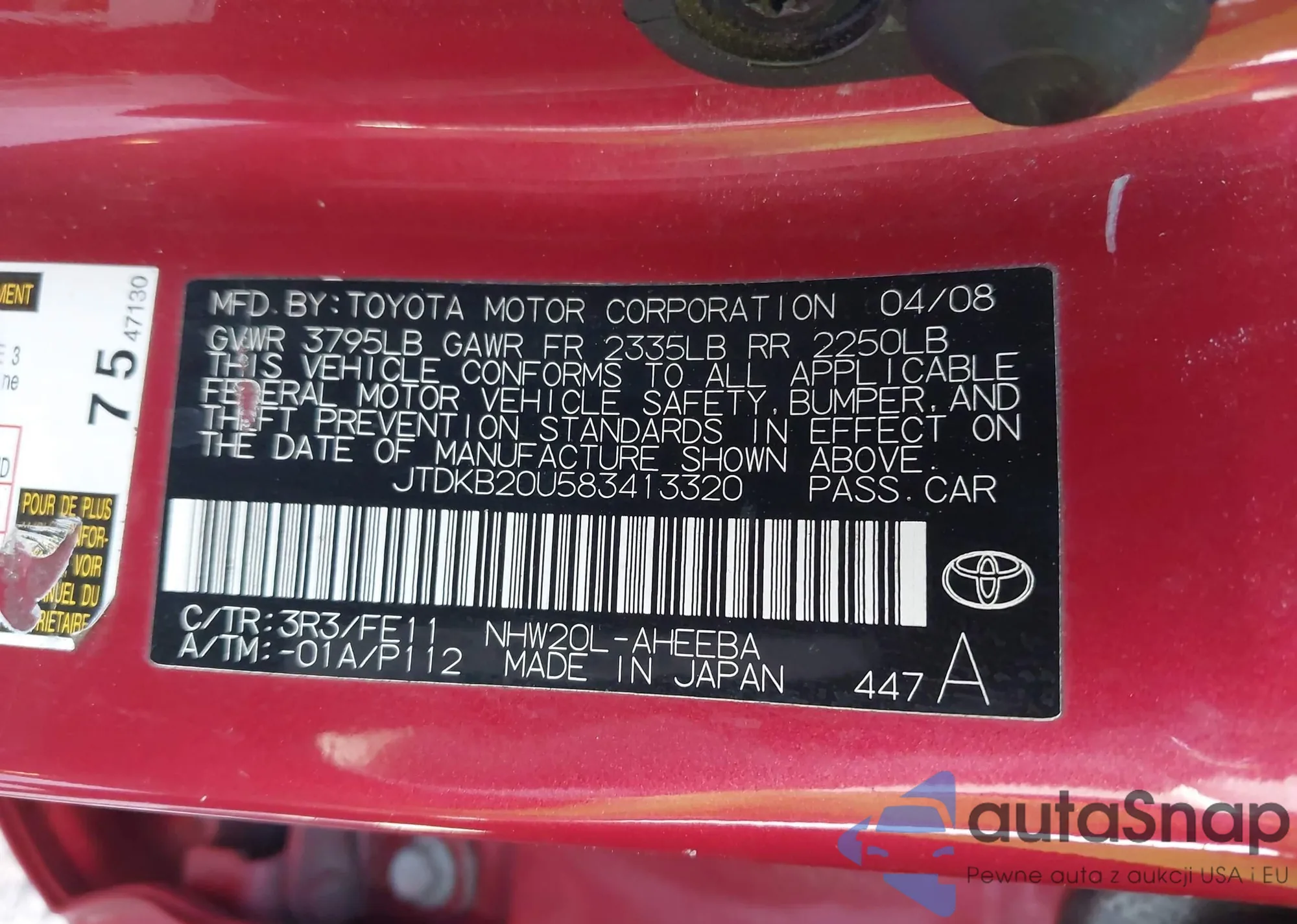 LOT: 43505038 VIN: JTDBT923081282190