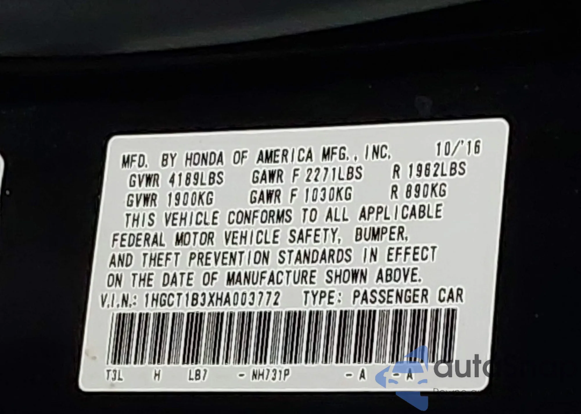 LOT: 43160153 VIN: 1HGCT1B3XHA003772