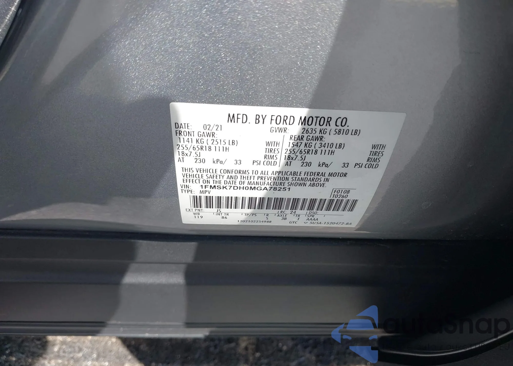 LOT: 43303688 VIN: 5UXTY3C07M9E58110