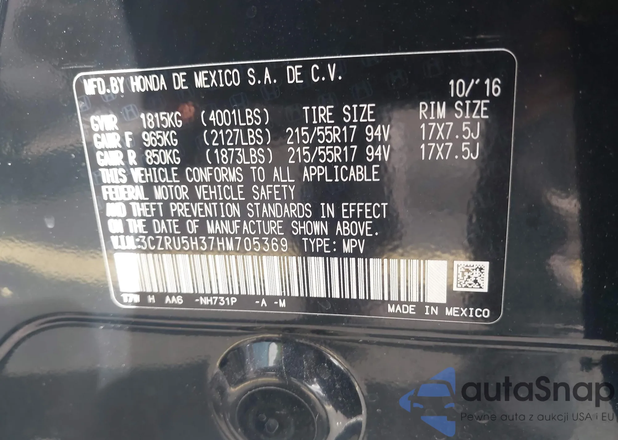 • VIN 3CZRU5H37HM705369