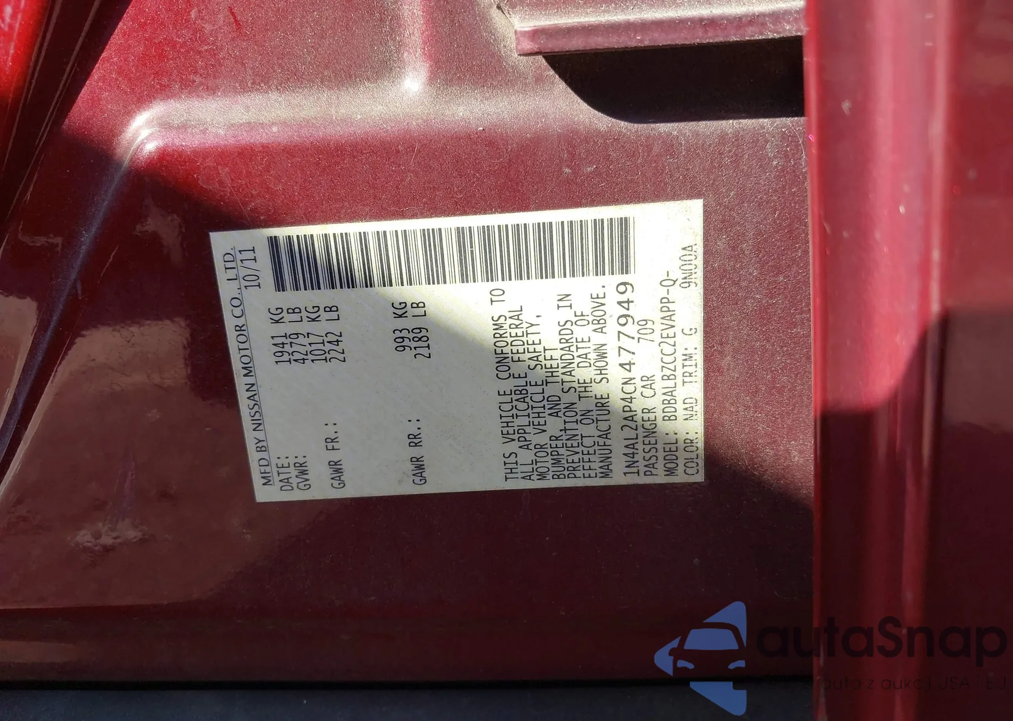 LOT: 43418051 VIN: 1N4AL2AP4CN477949