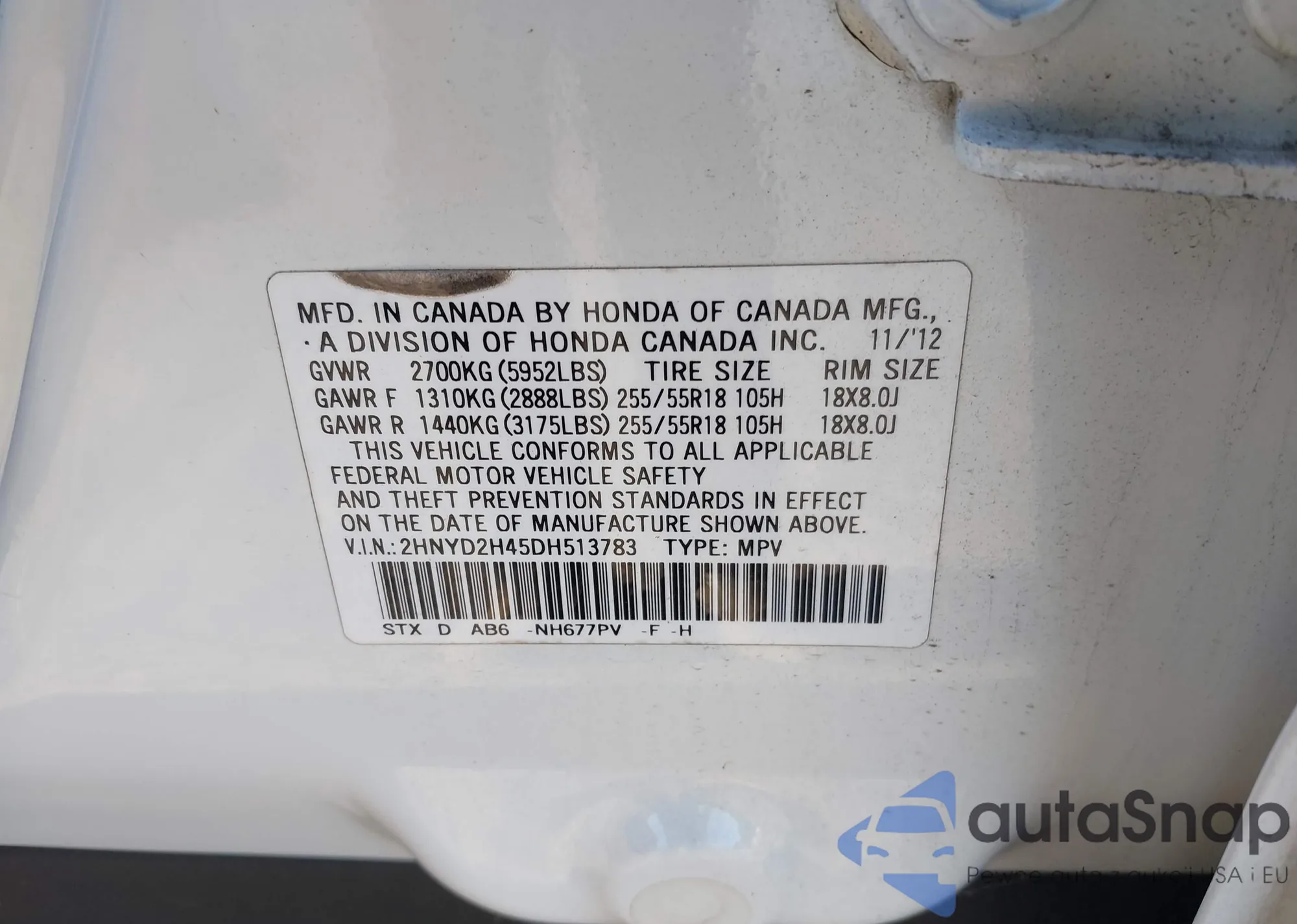 LOT: 43386967 VIN: 5FNYF6H58NB010014