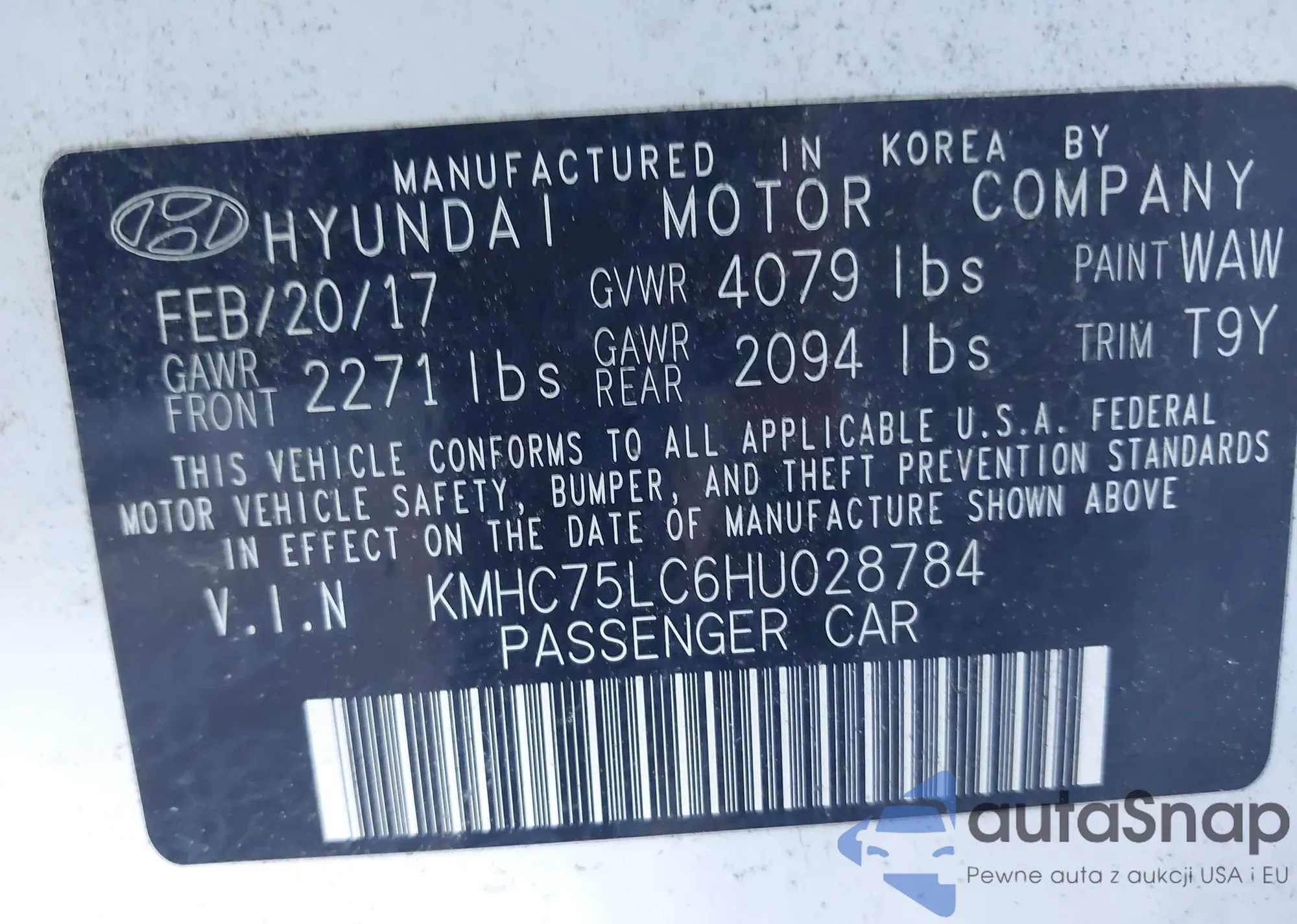 LOT: 43459230 VIN: KMHC75LC6HU028784